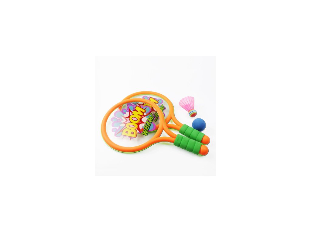 Otroški loparji za badminton v oranžni in zeleni barvi z motivom dinozavra. Udoben oprijem zahvaljujoč mehki peni.