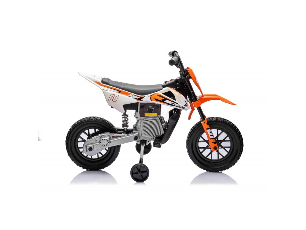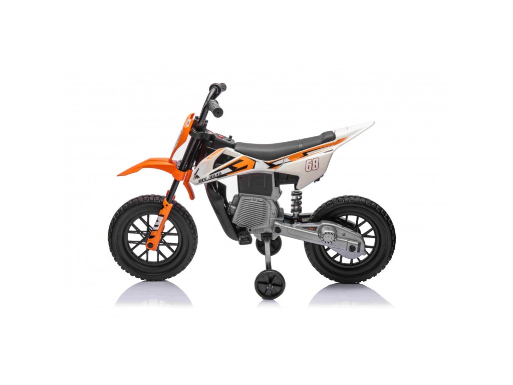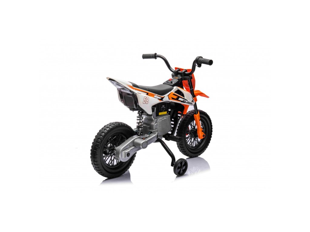Otroški motor na akumulator Cross Pantone 361C oranžna ima dva motorja z močjo 30W in baterijo kapacitete 12V 4,5Ah. Motor ima olajšana EVA pena kolesa, ki se prilagodijo različnim tipom površin. Za mlajše voznike motor ponuja stranska kolesca, ki jih lahko preprosto odstranite, ko otrok nekoliko zraste.