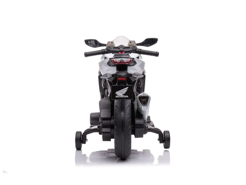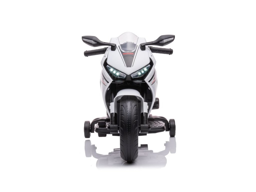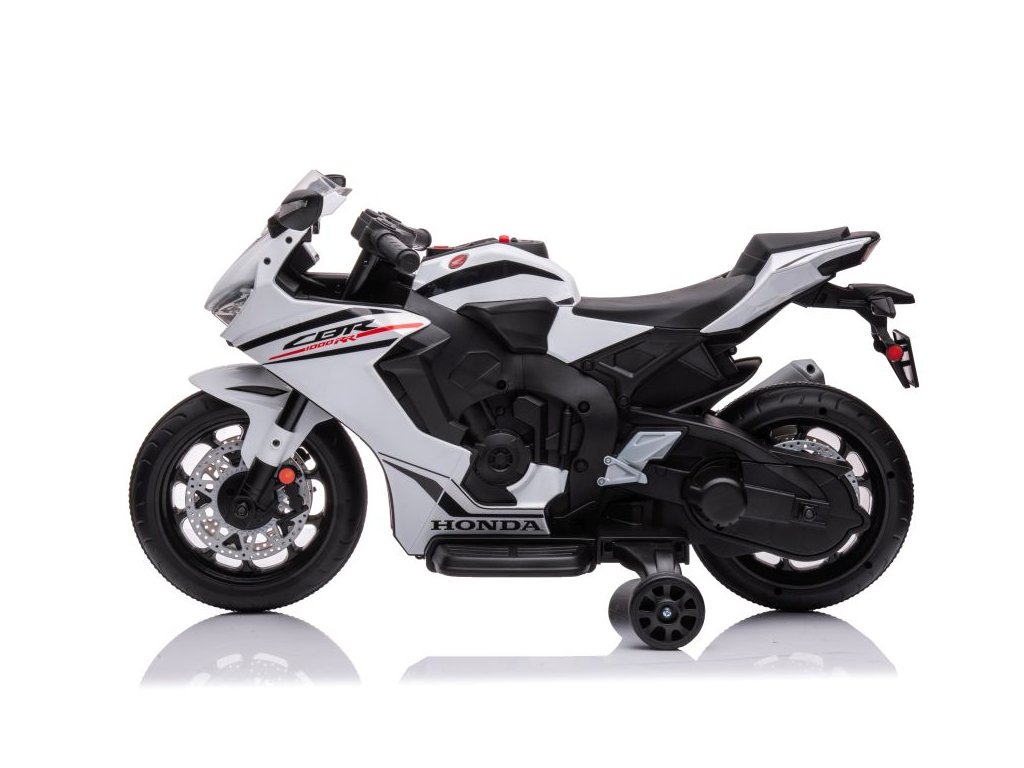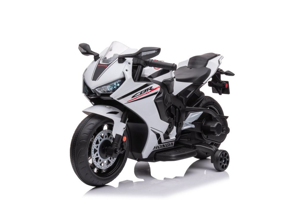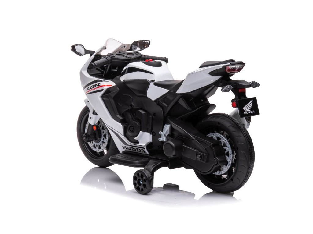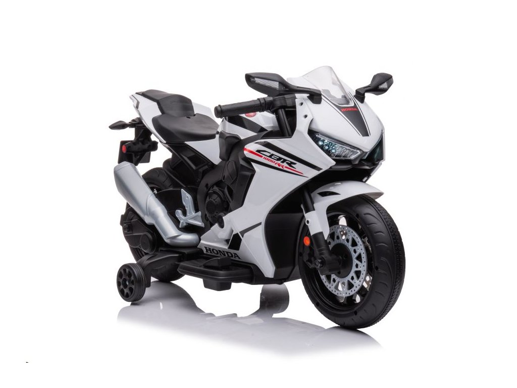 Otroški motor na akumulator Honda CBR 1000RR bela ima električni motor, ki omogoča vožnjo do 4 km/h, plastična kolesa z gumijastim robom, kar zagotavlja udobno vožnjo.