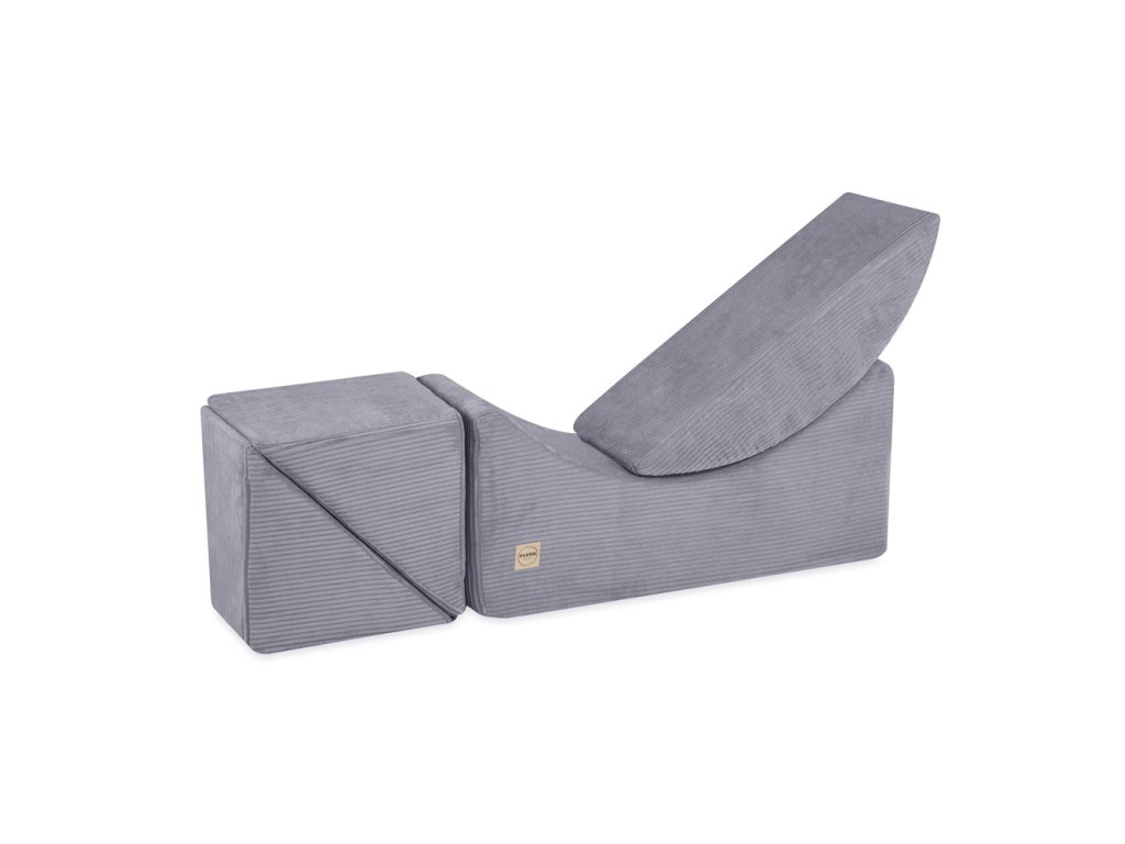 Podnožnik: Ta modul je sestavljen iz dveh trikotnih delov, ki ju lahko postavite skupaj ali ločeno. Skupaj tvorita udoben kvadratni podnožnik. Ločeno lahko deli služijo kot podnožniki ali majhni sedeži, kar prinaša dodatne možnosti za igro in ureditev. Zahvaljujoč tej rešitvi je puf še bolj funkcionalen in kreativno prilagodljiv otroškim potrebam.