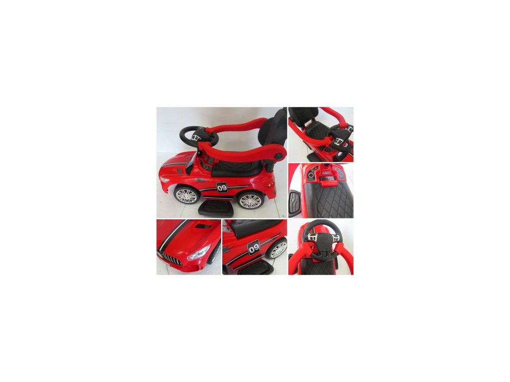 Otroški poganjalec J7 3v1 z zvočnimi učinki rdeč zagotavlja varnost med vožnjo zahvaljujoč zasnovi, ki preprečuje prevrnitev. Med bogato opremo sodita hupa in melodije na volanu. Poganjalec ima odstranljive nožne opore, zaščitne ročke in vodilno palico.