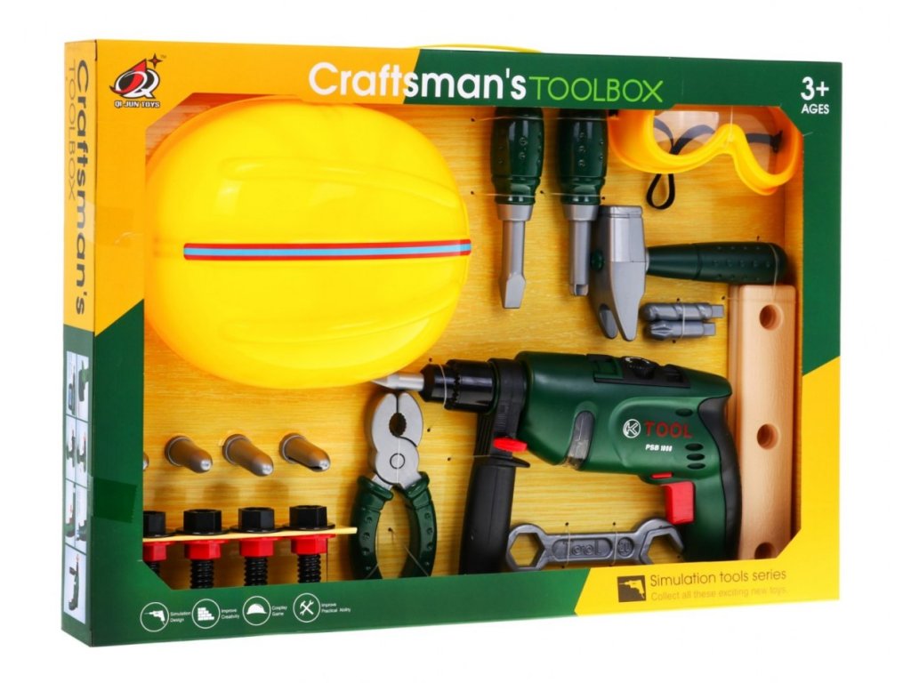 Otroški set orodje s vrtalnikom, čelado, očali in orodjem je primeren za otroke od 3. leta starosti. Igrača pozitivno vpliva na razvoj logičnega razmišljanja, spodbuja ustvarjalnost in podpira koordinacijo oči in rok.