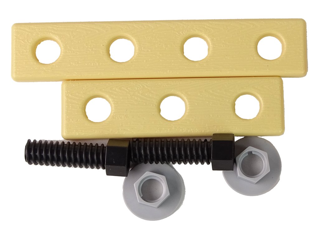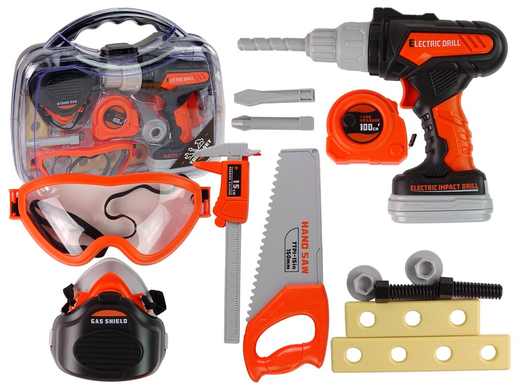 Celoten set je shranjen v praktičnem kovčku. Notri se nahaja orodje, izdelano iz plastike. Izvijač deluje na baterije; po vstavljanju baterij in pritisku na gumb se vrtalnik zavrti ter oddaja realistično zvok. Med delom lahko zaradi varnosti nosi zaščitna očala in masko. Za natančno delo bo koristil majhen centimetrov trak in žaga za izrezovanje. Vsi elementi olajšajo delo in učijo upravljanja.