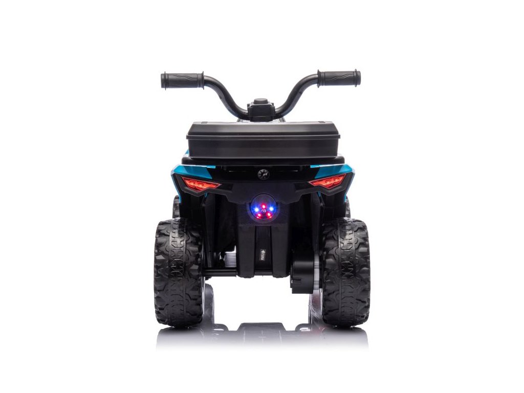 Otroški štirikolesnik na akumulator je opremljen z motorjem s močjo 35W in širokimi penastimi kolesi EVA. Med opremo spada glasbeni panel. Štirikolesnik ima sprednje luči in njegova nosilnost je do 20 kg.
