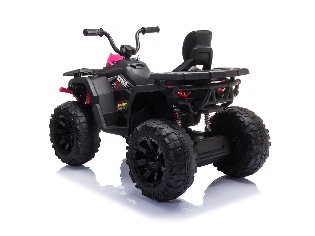 Otroški štirikolesnik na akumulator SpeedPro je opremljen z dvema motorjema z močjo 200W in dvema baterijama s kapaciteto 12V 4,5Ah. Štirikolesnik ima samodejni menjalnik in gumb, ki omogoča preklop hitrosti – višja in nižja hitrost. Hitrost štirikolesnika je v razponu 3-8 km/h.