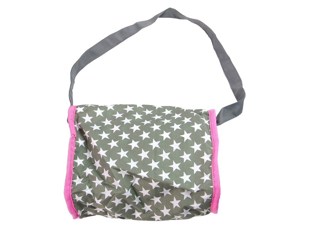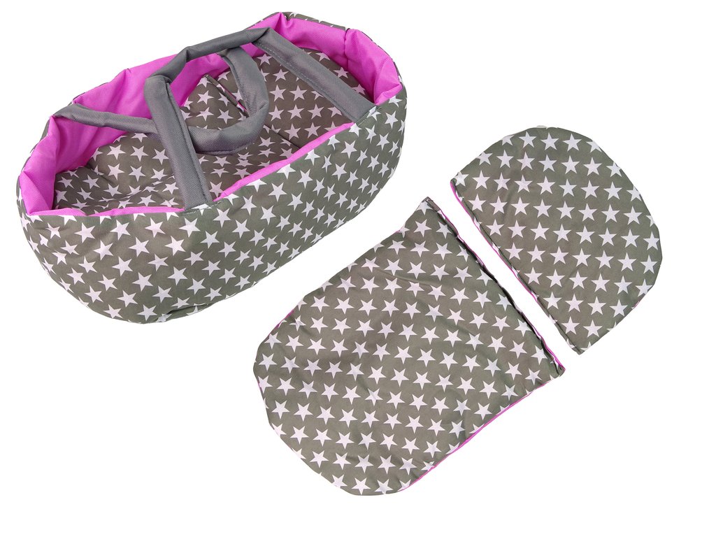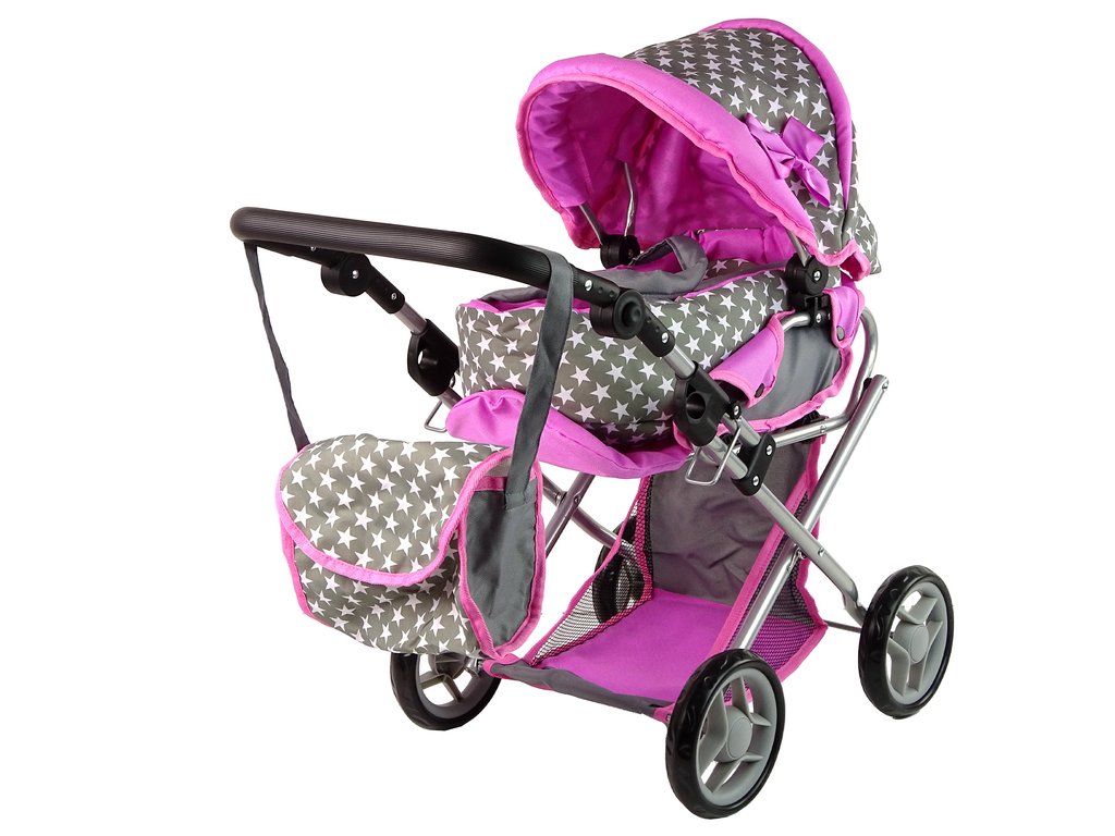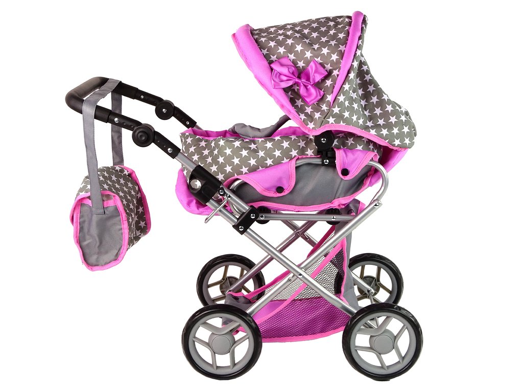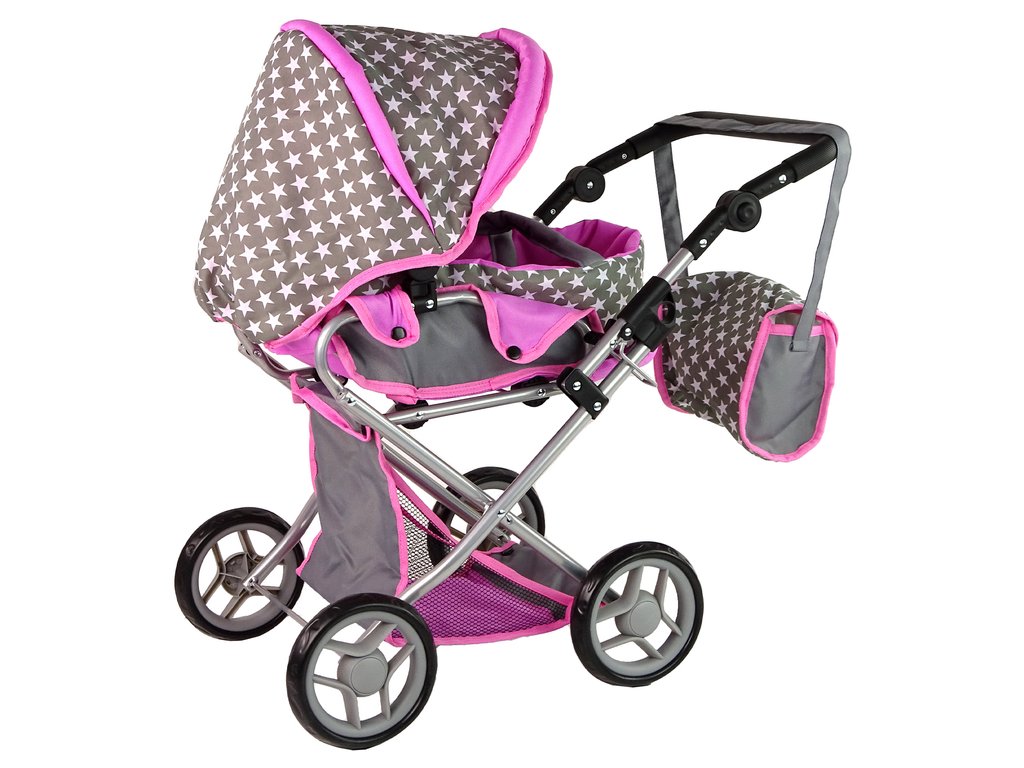 Voziček z vrečko je sive barve z belimi zvezdicami, kar mu daje veliko šarma. Dizajn spominja na pravi model, kar dodaja realizem. Konstrukcija je narejena iz močnih in trpežnih aluminijastih cevi srebrne barve, povezanih s črnimi plastičnimi spoji. Uporaba visoko kakovostnega materiala za izdelavo vozička zagotavlja udobje in prijetno uporabo igrače, kar skupaj z vozičkom na štirih ozkih kolesih povečuje enostavnost vodenja in manevriranja z vozičkom.