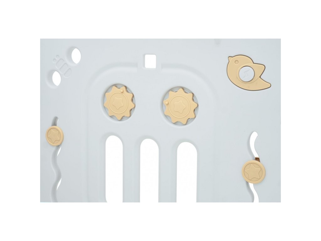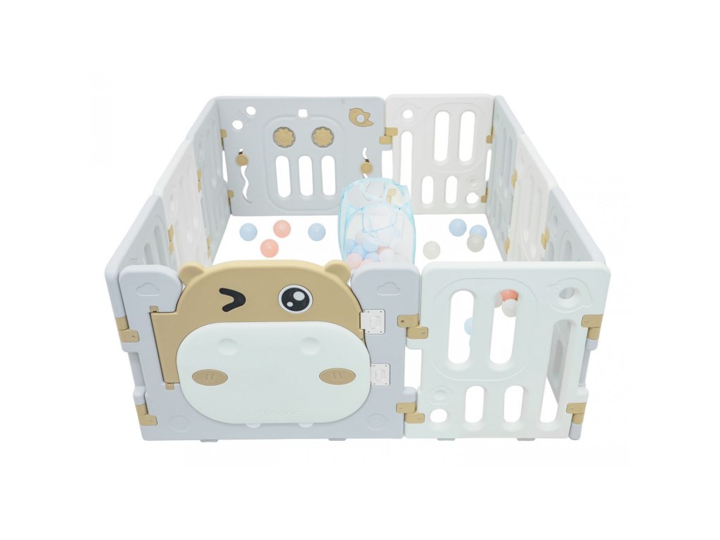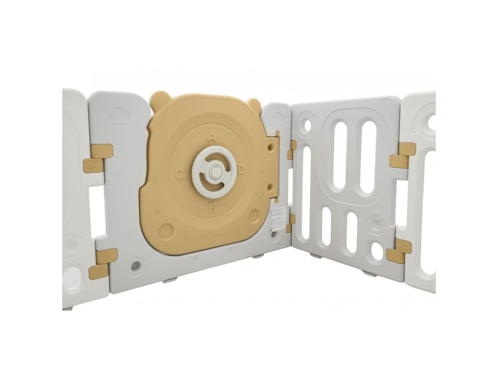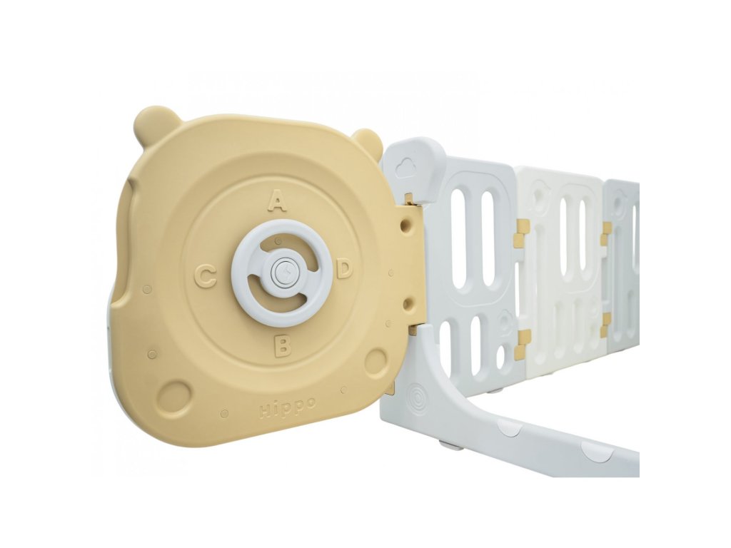 Velika in varna ograda Hipcio ponuja idealen prostor za igro otrokom od 6. meseca starosti. Zahvaljujoč spremenljivemu sistemu jo je mogoče po potrebi sestaviti v poljubno obliko. Konstrukcija je stabilna, ima gladke robove in nedrseče nogice. V notranjosti ograde boste našli zabavne igralne elemente , kot so vrtljiv volan, piščalka, kolesa ali zobniki, ki podpirajo senzorični razvoj in motorične sposobnosti. Paket vsebuje tudi košaro in 40 plastičnih žogic. Varnostna ključavnica vrat se nahaja na zunanji strani, tako da jih otrok ne more sam odkleniti.