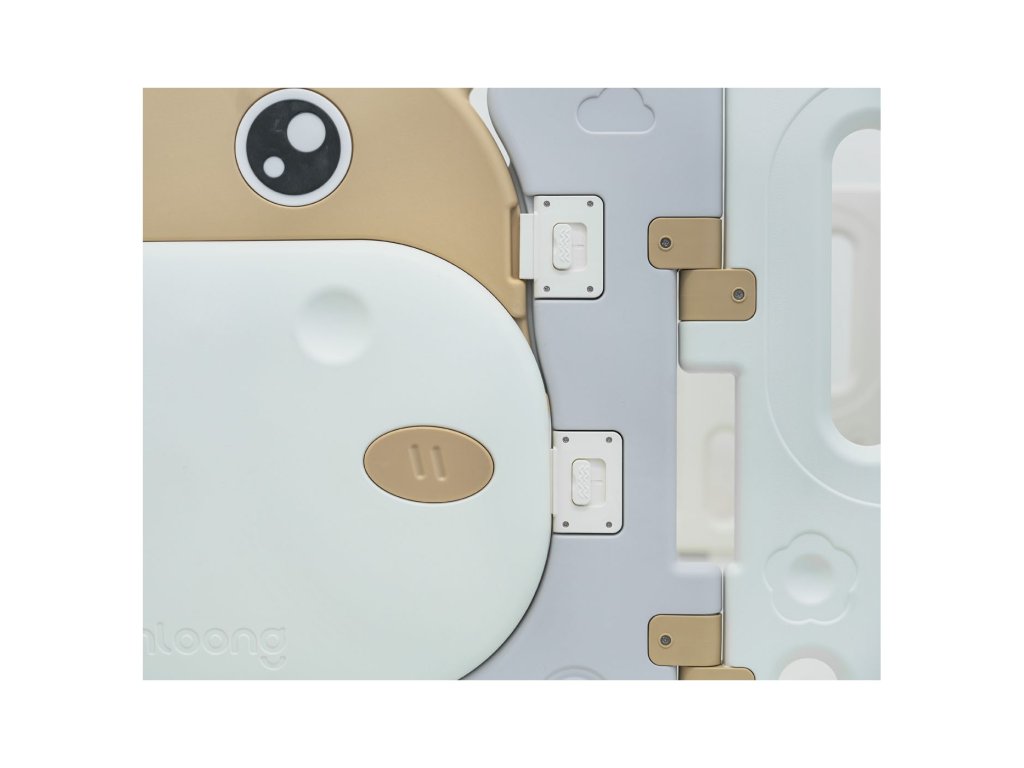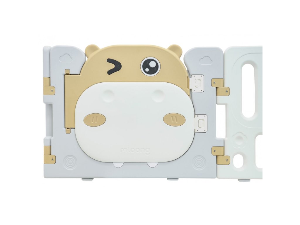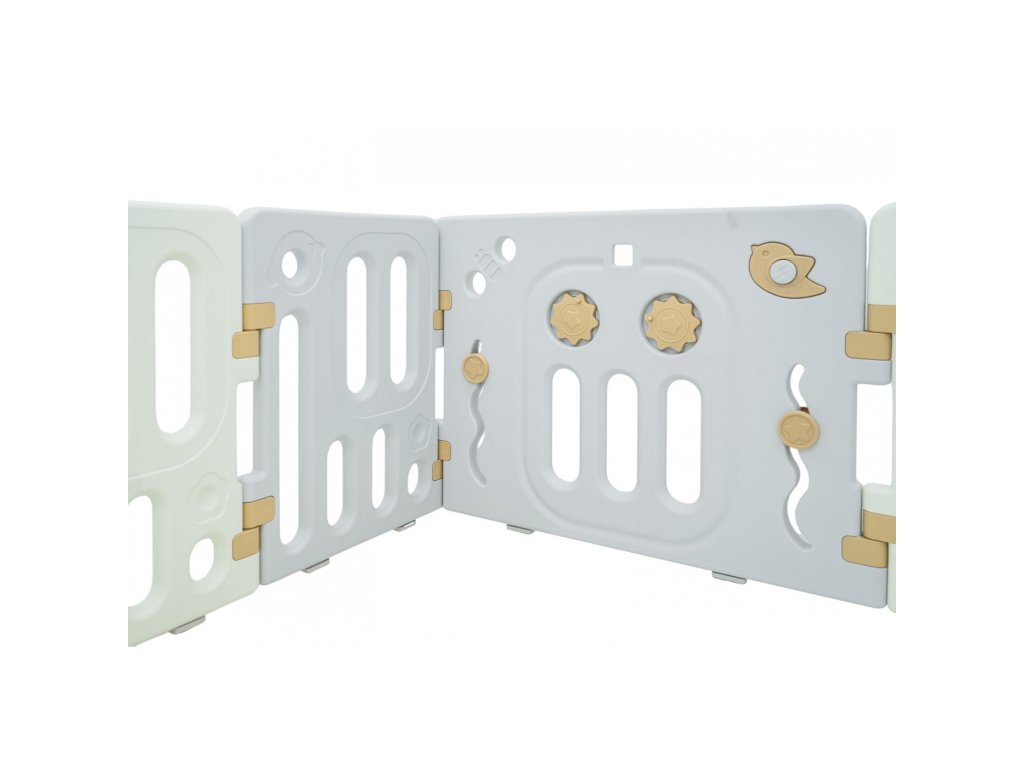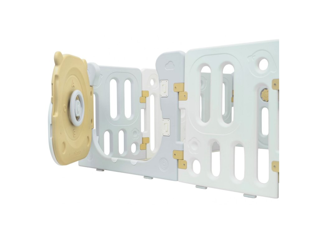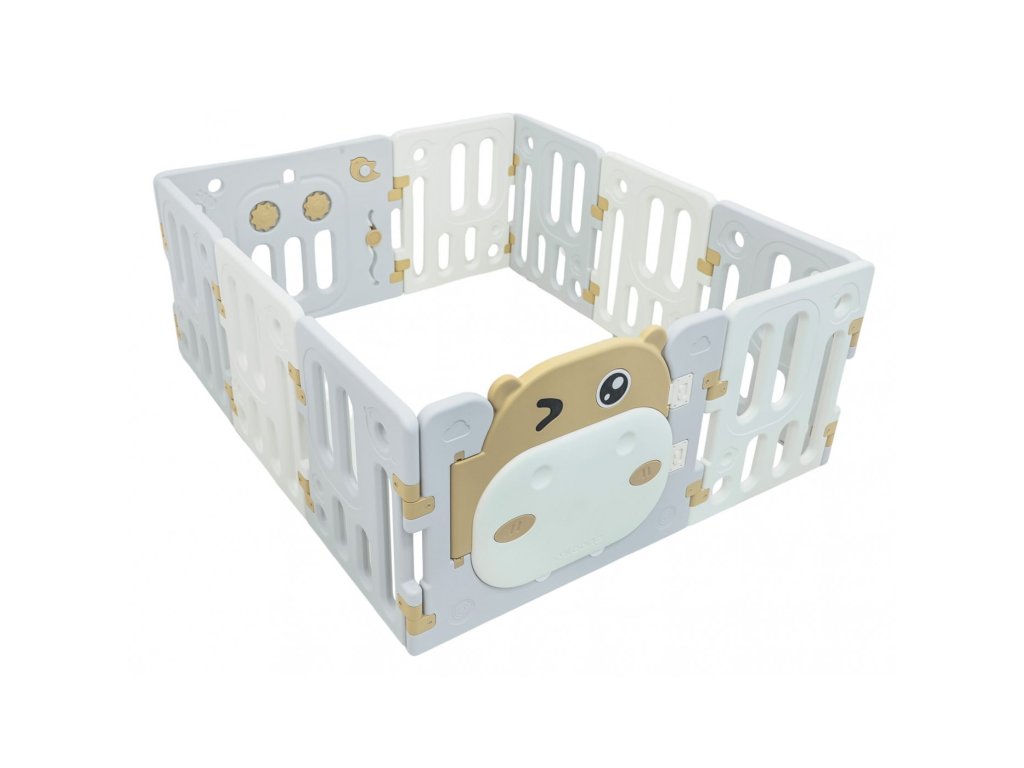 Velika in varna ograda Hipcio ponuja idealen prostor za igro otrokom od 6. meseca starosti. Zahvaljujoč spremenljivemu sistemu jo je mogoče po potrebi sestaviti v poljubno obliko. Konstrukcija je stabilna, ima gladke robove in nedrseče nogice. V notranjosti ograde boste našli zabavne igralne elemente , kot so vrtljiv volan, piščalka, kolesa ali zobniki, ki podpirajo senzorični razvoj in motorične sposobnosti. Paket vsebuje tudi košaro in 40 plastičnih žogic. Varnostna ključavnica vrat se nahaja na zunanji strani, tako da jih otrok ne more sam odkleniti.