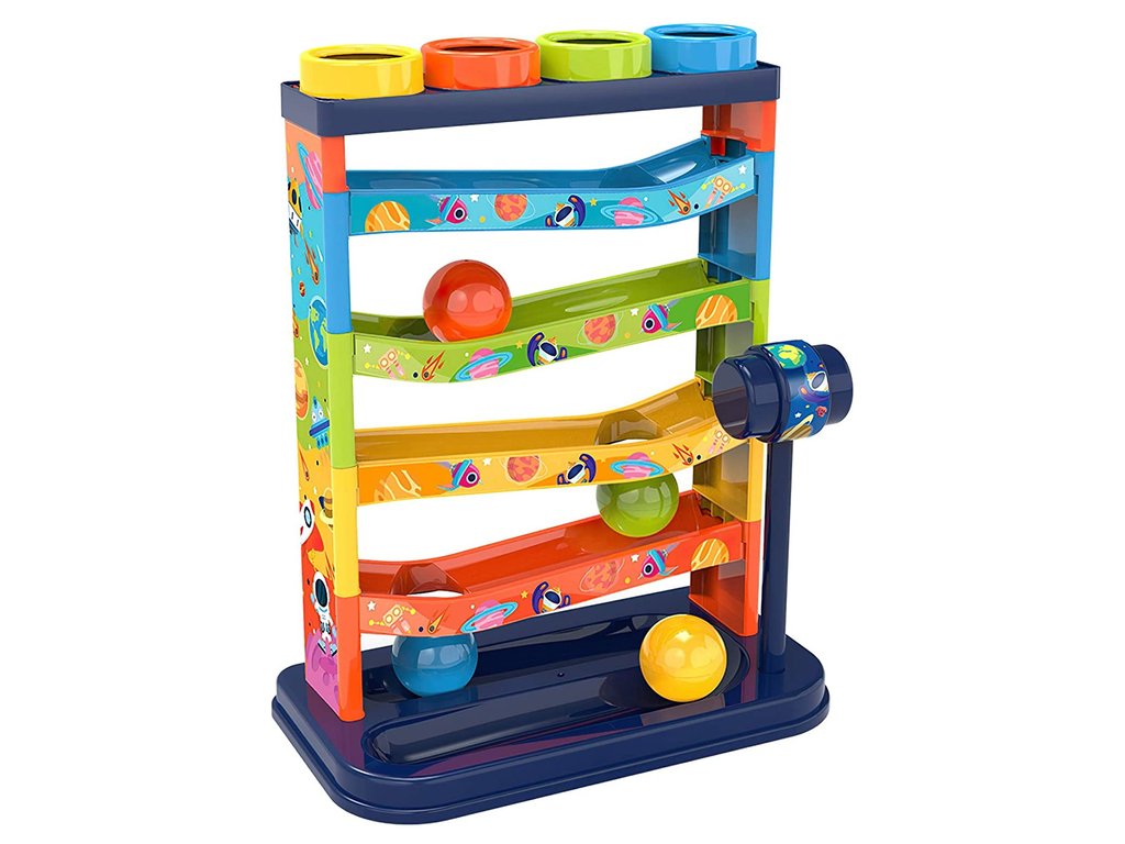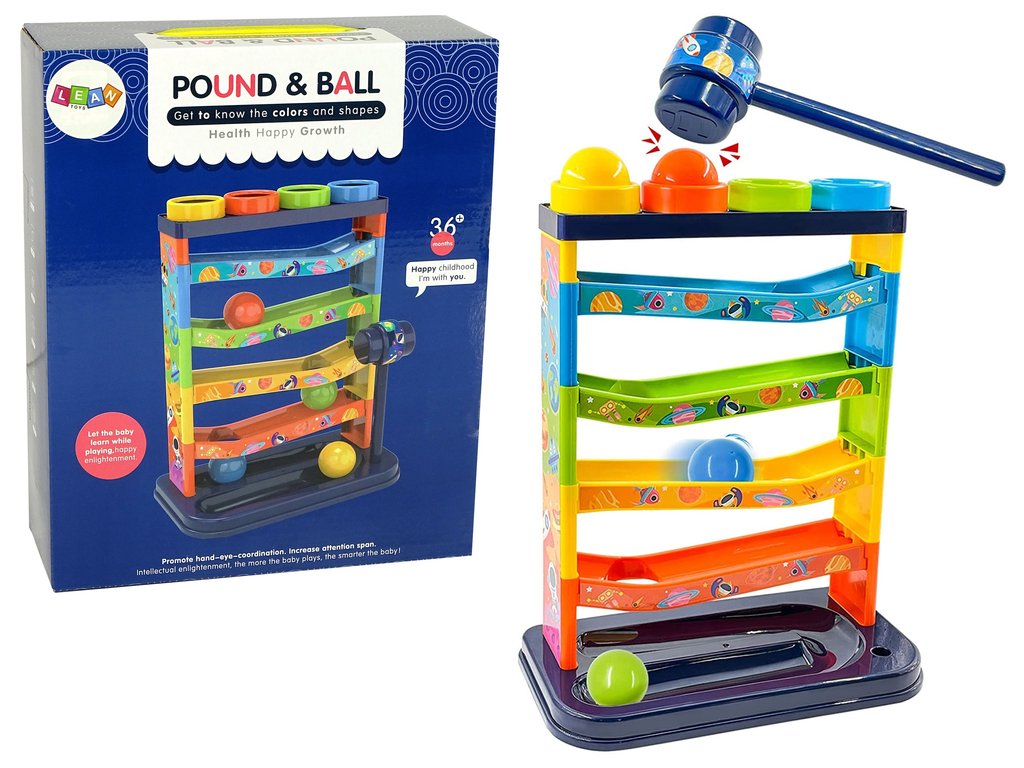 Igra s kroglično dirkališče pomaga otrokom razvijati fino motoriko, natančnost in koordinacijo roka-oko. Kako poteka igra? Otrok položi kroglice na zgornjo ploščo, da kroglice padejo na stezo, pri tem pa mora uporabiti kladivce. Kroglice med gibanjem po stezi ropotajo, kar pritegne otrokovo pozornost.