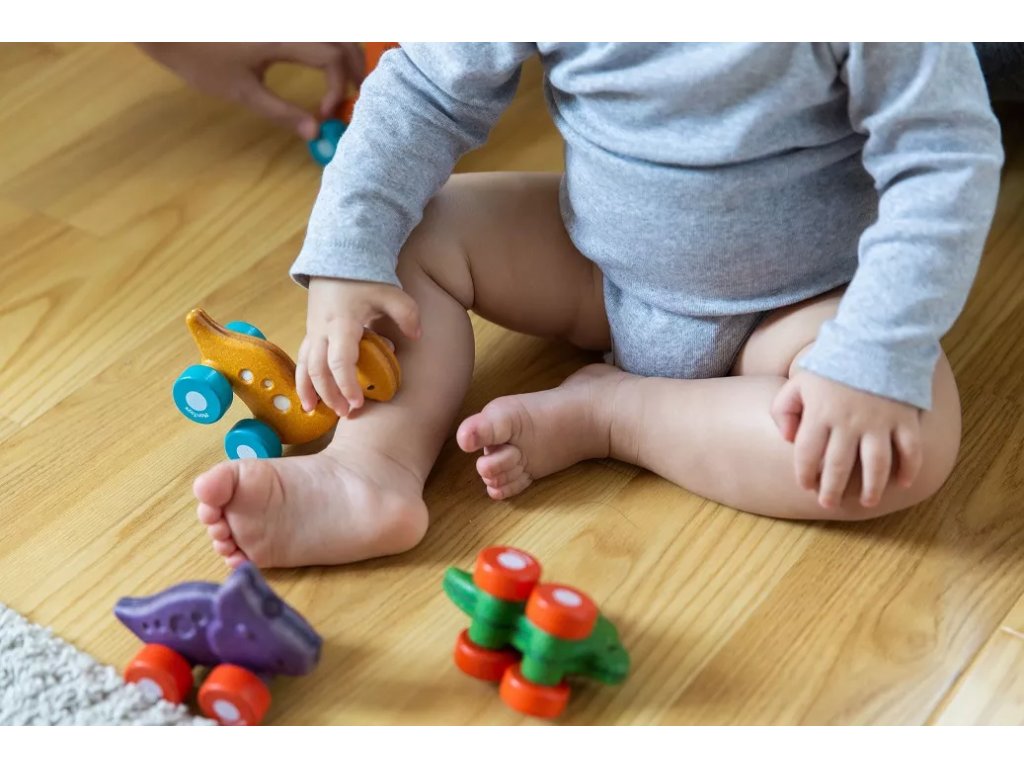 Simpatičen dino avto iz lesene delavnice PlanToys je primeren za majhne otroške roke in spodbuja igro, ki temelji na gibanju in raziskovanju.
