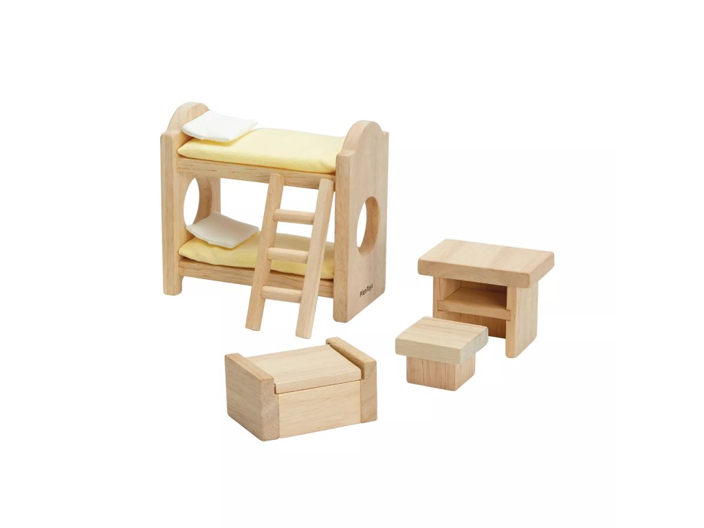Dopolnite svojo hiško za punčke s klasično otroško sobo znamke PlanToys. Komplet spodbuja razvoj socialnega zaznavanja, domišljije, ustvarjalnosti in jezikovnih spretnosti.