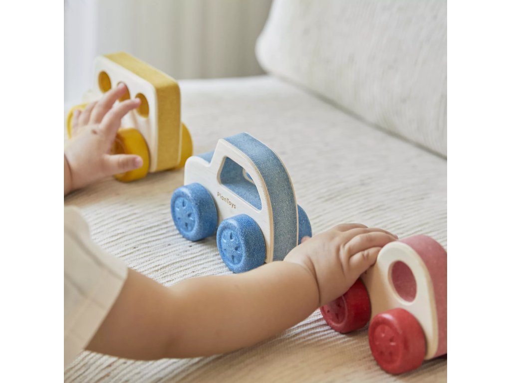 Majhen lesen avto v modri barvi, zasnovan za majhne otroke. Spodbuja domišljijsko igro, fino motoriko in koncentracijo; dobro se prilega otroški roki, je trden in enostaven za potiskanje.