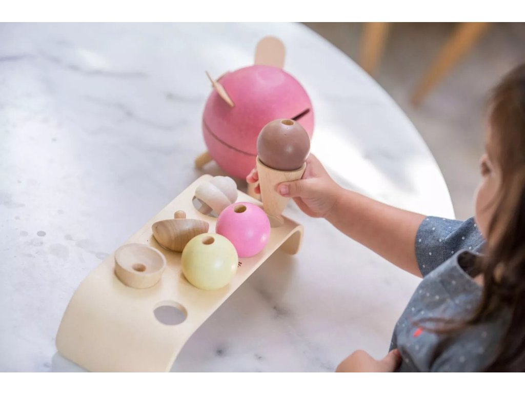 Stojalo prihaja iz delavnice podjetja Plan Toys. Komplet je namenjen urjenju domišljije in otrokom omogoča sestavljanje posameznih delov sladoleda v kornet ali na pladenj.