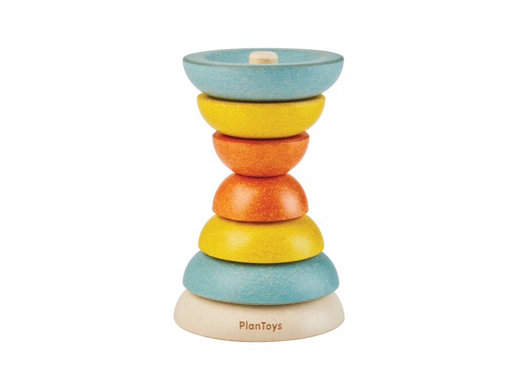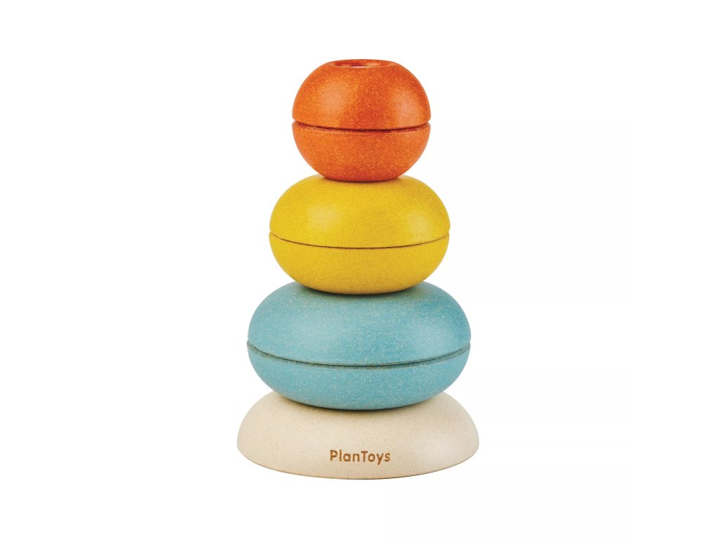 Igrača za zlaganje iz kavčukovega lesa, namenjena majhnim otrokom, ki razvija fino motoriko, koordinacijo oko-roka in logično razmišljanje s preprosto in varno igro.