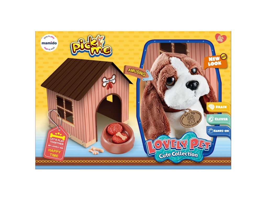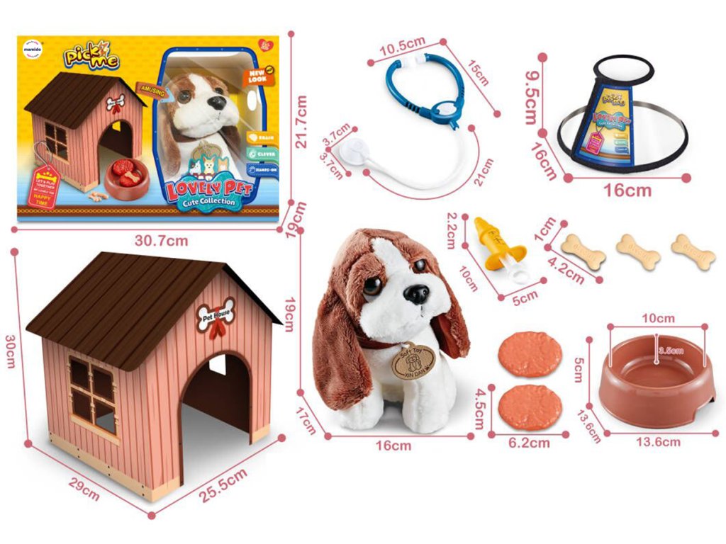V kompletu so posode, kocke, hrana, injekcije in stetoskop, s katerimi se bodo otroci naučili skrbeti za živalico, jo hraniti in nadzorovati njeno zdravje. Hiška se enostavno zloži in služi kot prijetno mesto za psička.