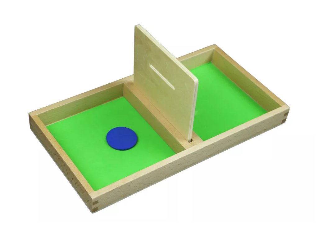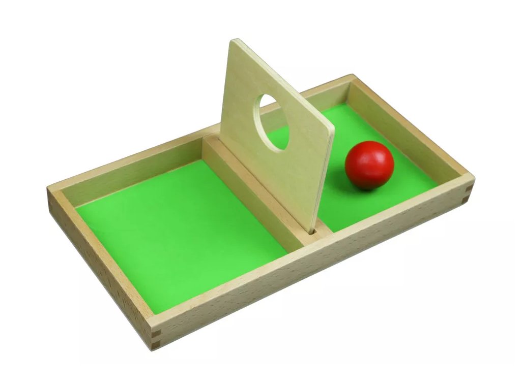 Skozi luknjo v leseni odstranljivi tabli na sredini pladnja otroci potiskajo disk ali žogico, s čimer razvijajo koordinacijo oči in rok ter vadijo gibanje prstov in zapestja.