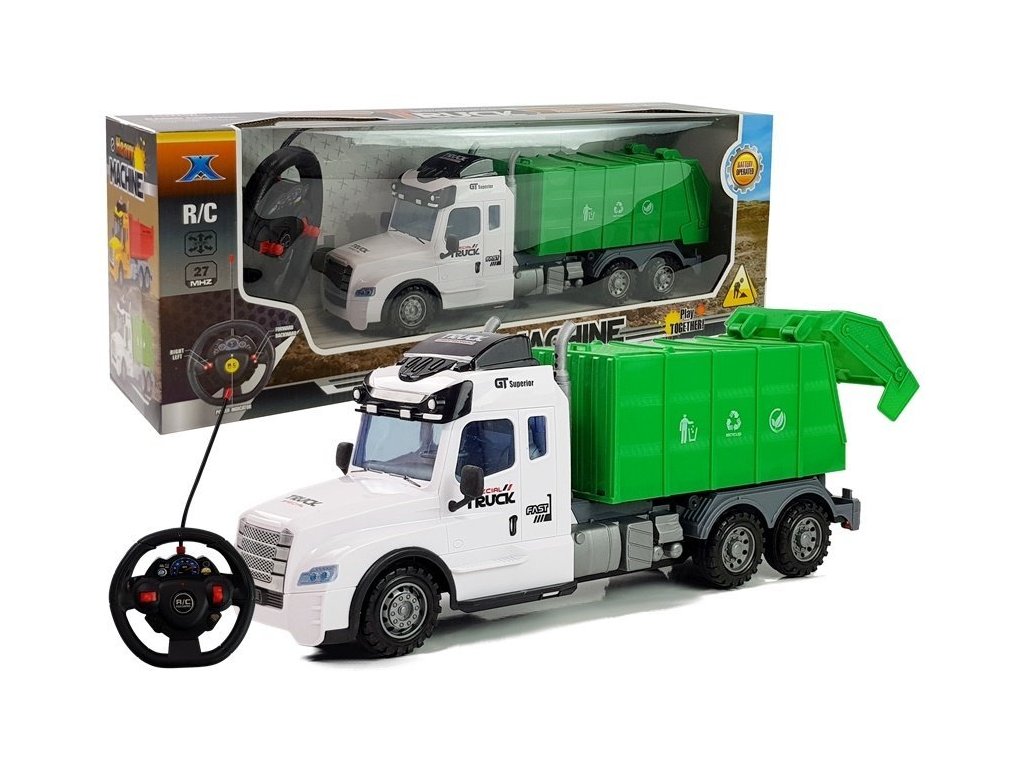 Konstrukcijski voziček na daljinsko vodenje za otroke je opremljen s plastičnimi kolesi s profili, ki omogočajo igro na različnih podlagah. Belo mešano vozilo z zelenim kontejnerjem je okrašeno z značilnimi nalepkami.