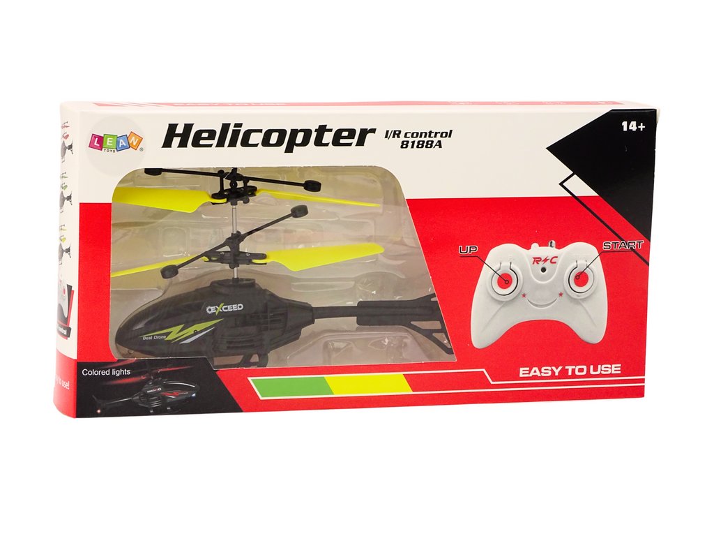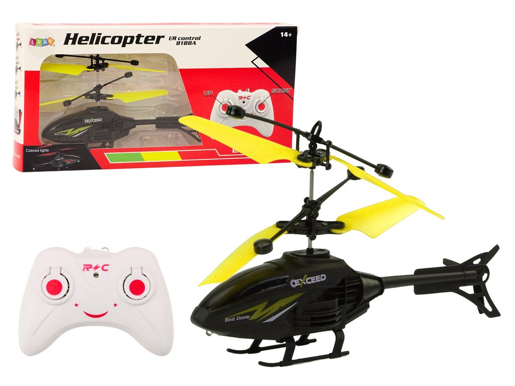 RC helikopter je majhen, lahek model, ki zaradi svoje nizke teže in aerodinamične zasnove odlično lebdi v zraku. Ima črno barvo z rumenimi elementi, kar ji daje sodoben in dinamičen videz.