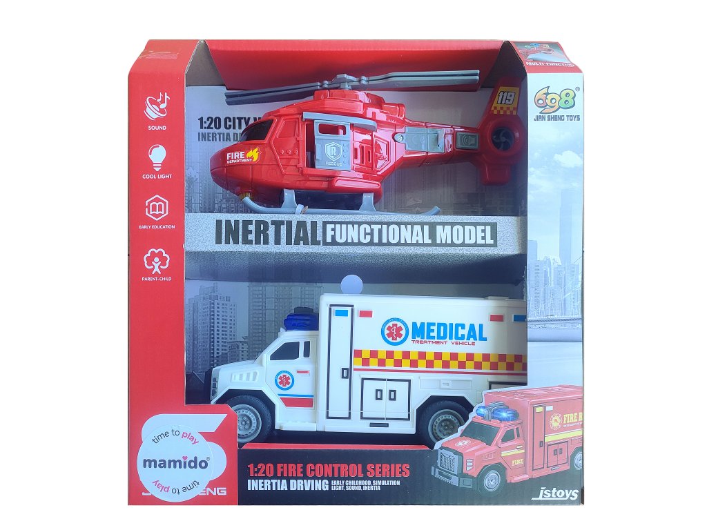 Akcijski reševalni komplet v merilu 1:20 je popolna igrača za vse male junake. Komplet vsebuje reševalno vozilo z lučnimi in zvočnimi efekti ter rdeč reševalni helikopter s premikajočo se eliso. Sanjski avto se napaja na vzmetni mehanizem, kar omogoča enostavno upravljanje in realistično simulacijo vožnje. Kombinacija rešilca in helikopterja omogoča otrokom ustvarjanje napetih reševalnih akcij ter spodbuja njihovo kreativnost in domišljijo. Igrača podpira razvoj motoričnih sposobnosti, domišljije in timskega sodelovanja pri skupni igri.