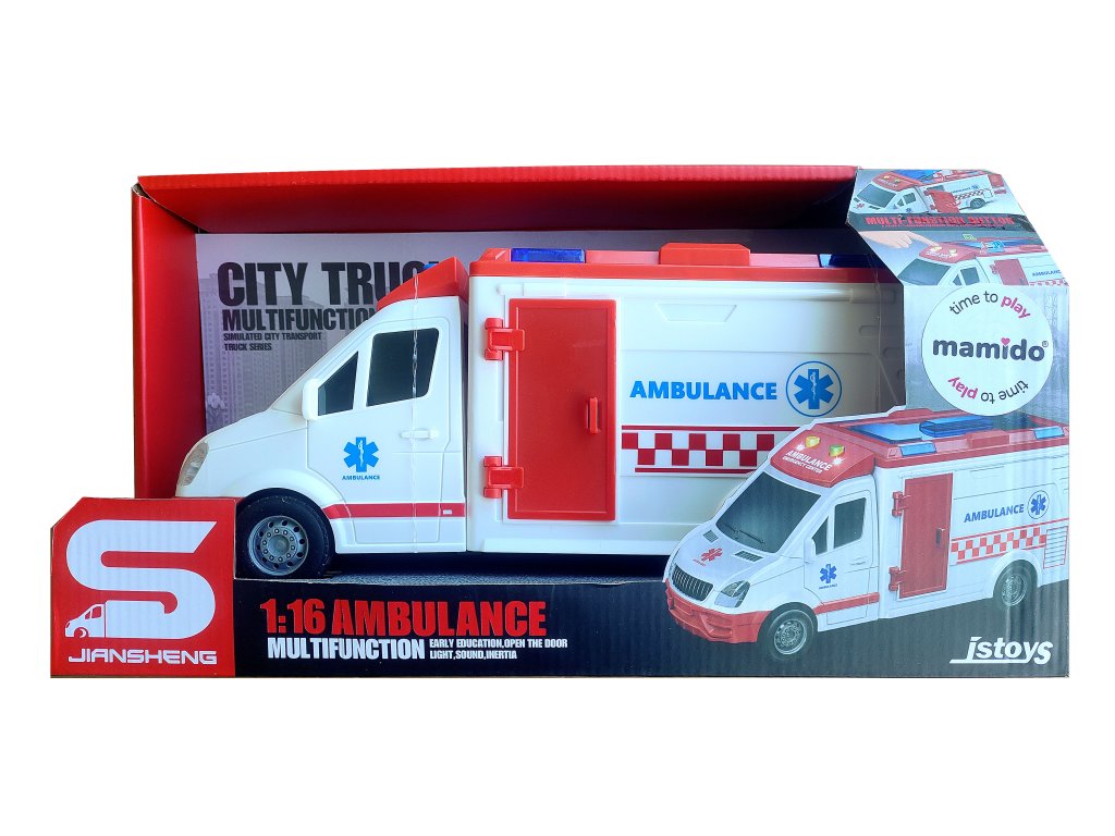 Reševalno vozilo v merilu 1:16 bo otrokom prineslo veliko zabave in poučnosti. Model je opremljen z svetlobnimi in zvočnimi učinki, ki simulirajo delovanje pravega reševalnega vozila. Priložena so tudi nosila, ki jih je mogoče shraniti v zadnji del reševalnega vozila. Odpirajoča se vrata in funkcija vztrajnika zagotavljajo še več možnosti igre. Idealen za male oboževalce reševalcev, ki želijo posnemati resnična dejanja.