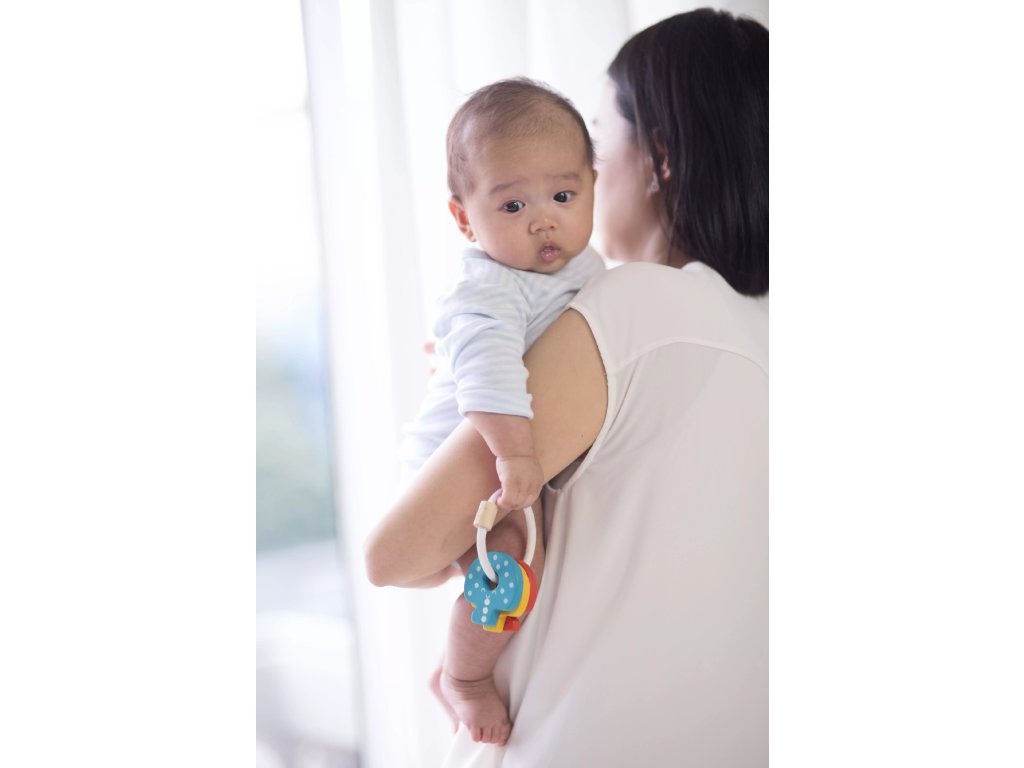 Svetli in pisani ključi na rožljanju spodbujajo razvoj fine motorike otroka med tresenjem. Ključi so lahki in jih majhne roke zlahka primejo.