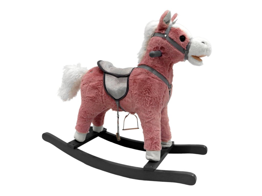 Ampak to ni vse! Naš konj ne le izgleda odlično, ampak deluje tudi na baterije. Upravljanje je izjemno enostavno zahvaljujoč gumbom, nameščenim na konjevih ušesih (baterije niso vključene v komplet). Udoben sedel zagotavlja, da je jezdec na njem varen, medtem ko kovinske nogice dolge 8 cm zagotavljajo stabilnost med guganje.