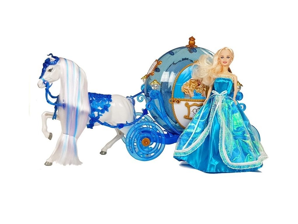 Nádherný kočár spojený s koněm vypadá jako z pohádky. Kulatá, průhledná struktura má otevírací dveře a také podřimovák, který usnadňuje loutce vstup dovnitř. Vozidlo je umístěno na čtyřech, pohyblivých kolech, zatímco jeho interiér je dokonale propracovaný ve všech detailech - o tom svědčí bílá, pikovaná pohovka a stěny. Třpytivý kočár má zlaté detaily ve formě pozoruhodných ornamentů. Bílý kůň je zdoben modrou, gumovou postroj, kterou lze jednoduše připevnit k kočáru.