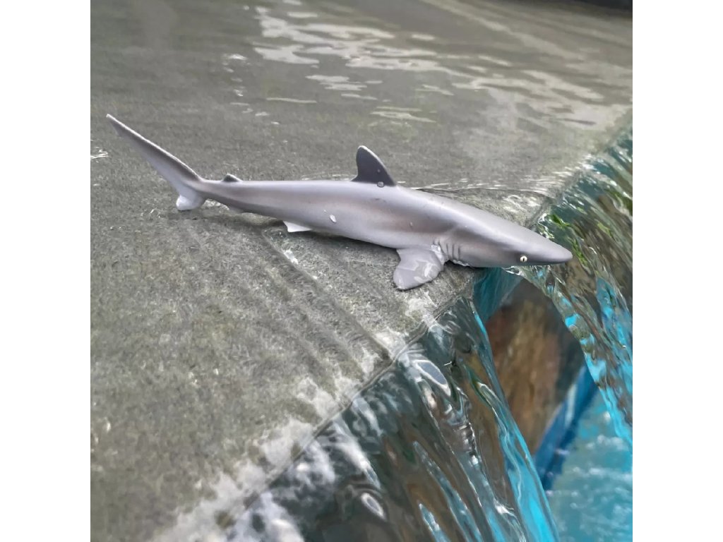 Podrobna figura velikega, vitkega morskega psa, ki se pojavlja na odprtem morju v bližini kopnega. Prehranjuje se z različnimi vrstami rib in se v naravi običajno giblje dlje od obale.