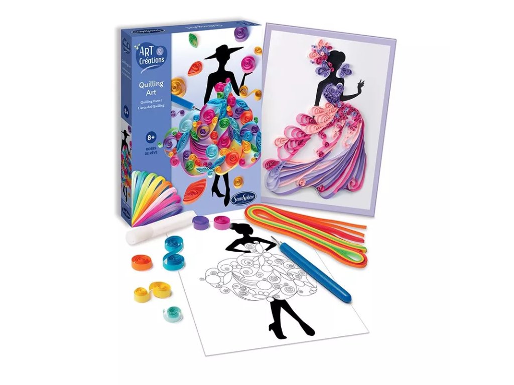 Kreativni komplet za tehniko quillinga, ki omogoča ustvarjanje okrasnih oblek, primernih kot okras za otroško sobo.