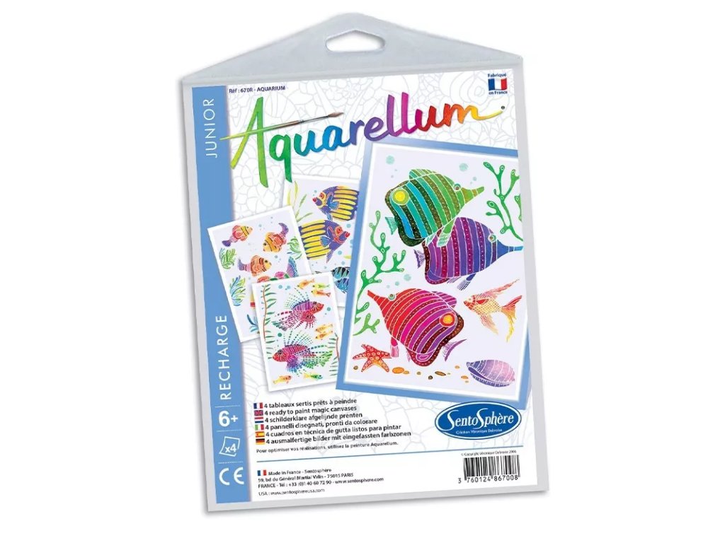 Komplet slik, namenjen slikanju z akvareli z motivi rib in akvarija. Primerno za otroke in začetnike, ki želijo vaditi tehniko in razvijati ustvarjalnost.