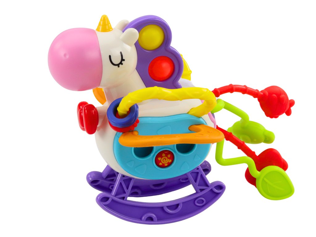 Opremljen z mehkimi gumijastimi elementi, idealnimi za grizenje in raziskovanje različnih tekstur, ter ropotuljami, ki oddajajo prijetne zvoke ob stresanju, konj spodbuja sluh in motorično koordinacijo.