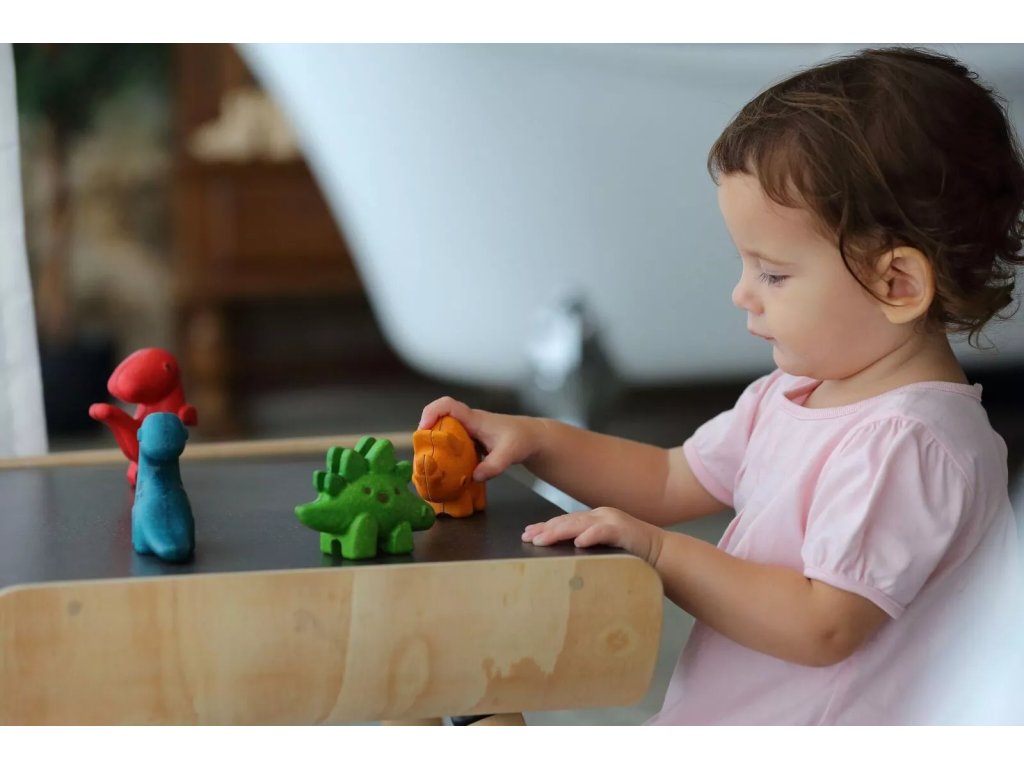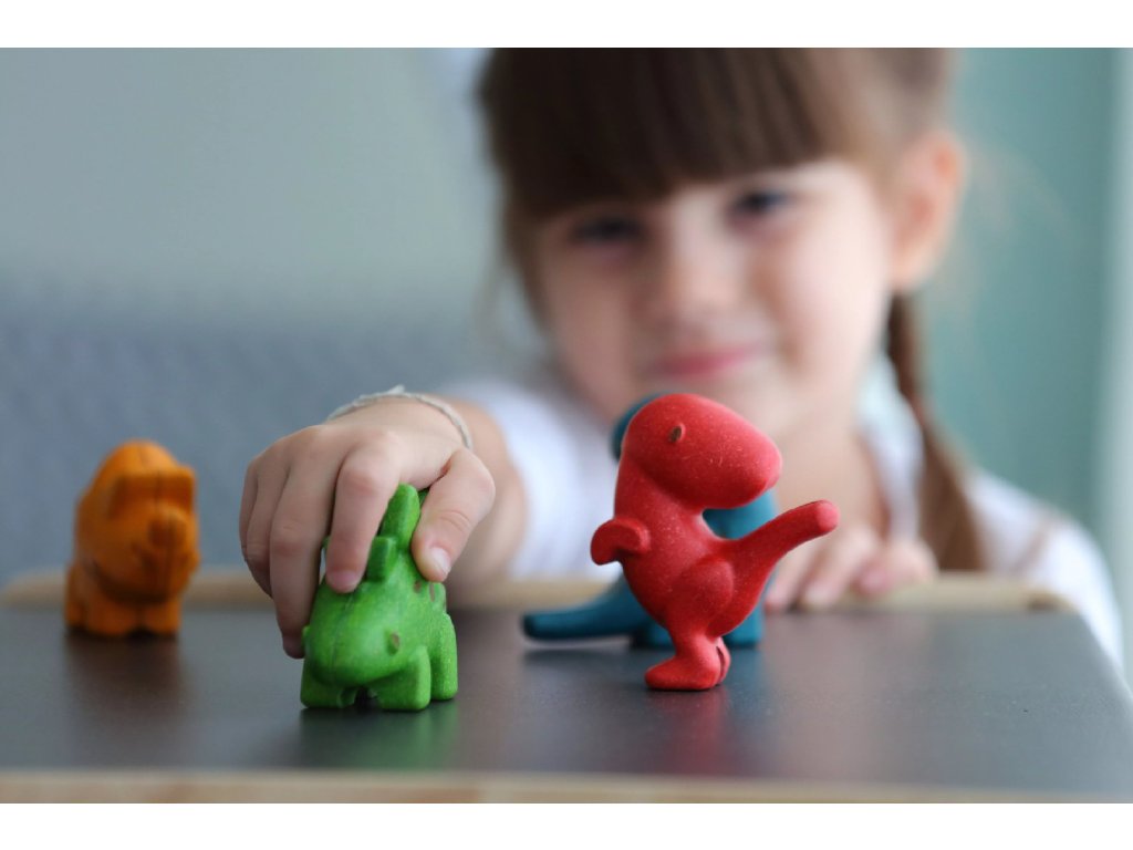 Dobrodošli v prazgodovinski svet. Komplet vsebuje štiri vrste dinozavrov: Tyrannosaurus Rex, Stegosaurus, Triceratops in Diplodokus. Prikupne lesene živali se dobro prilegajo otroški roki, igranje z njimi pa spodbuja razvoj domišljije in fine motorike.