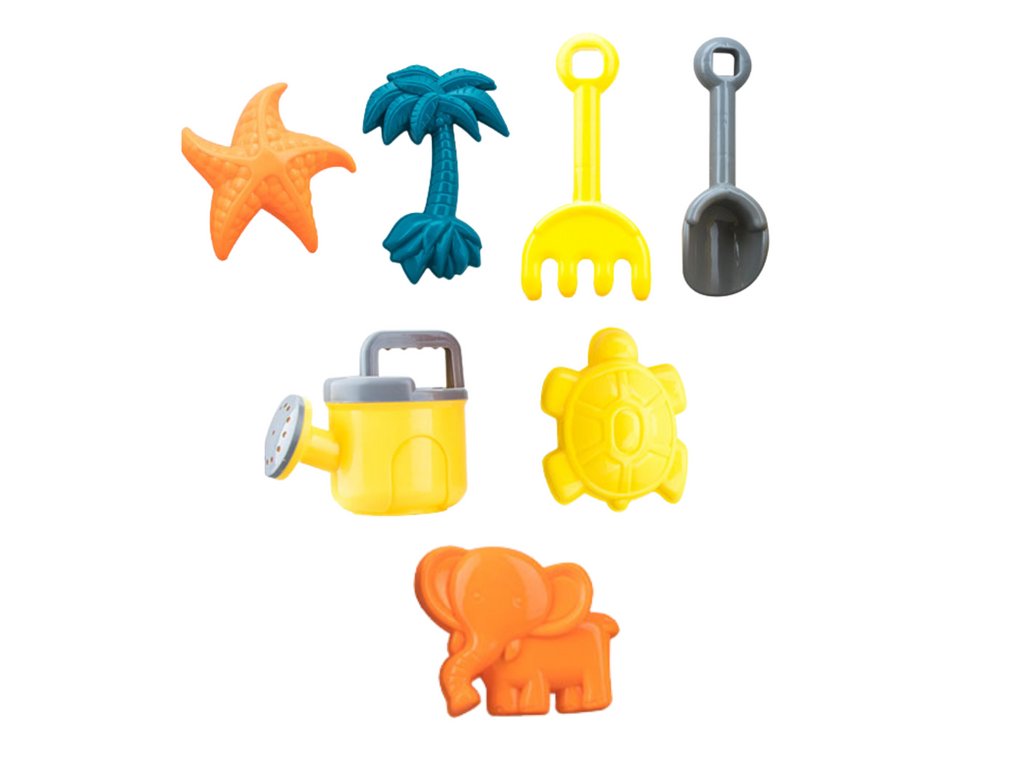 V setu so tudi štirje kalupi, lopatka, grablje in kanglica. Kalupi omogočajo ustvarjanje različnih peščenih figur, medtem ko sta lopatka in grablje nepogrešljiva za kopanje, sejanje in oblikovanje peska. Kanglica igri dodaja dodaten razsežek, saj otrokom omogoča zalivanje njihovih peščenih gradenj.