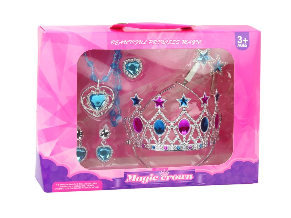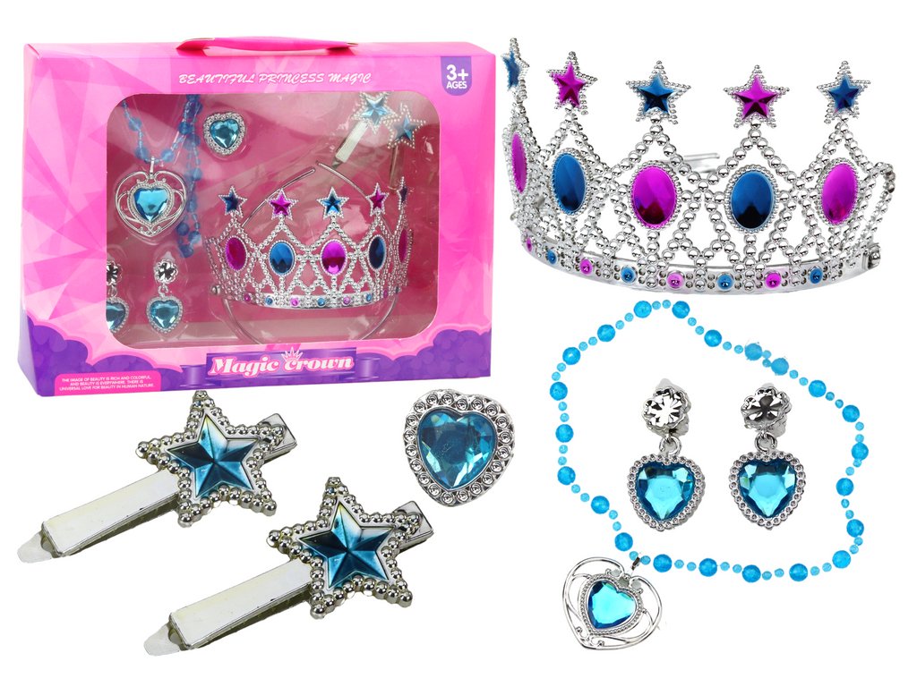 V kompletu je krona, okrašena z imitacijo diamantov v dveh očarljivih barvah: modri in roza. Ta krona ne le dodaja sijaj, ampak postane tudi simbol izjemnosti, ki si jo vsaka mala princeska želi občutiti.