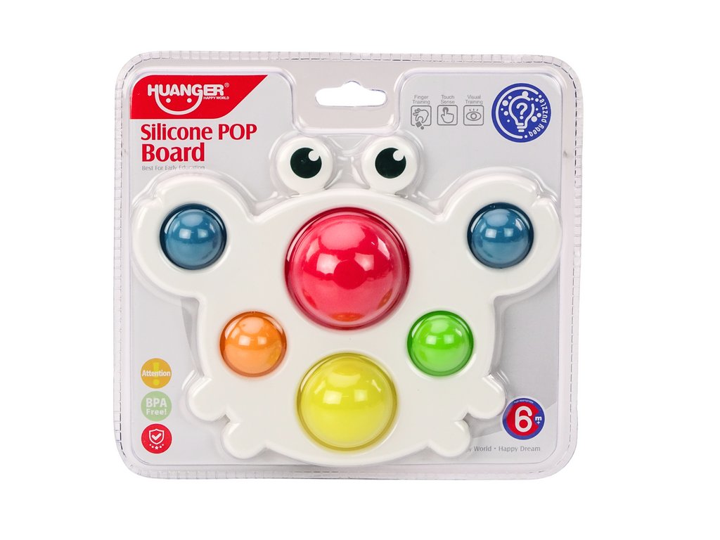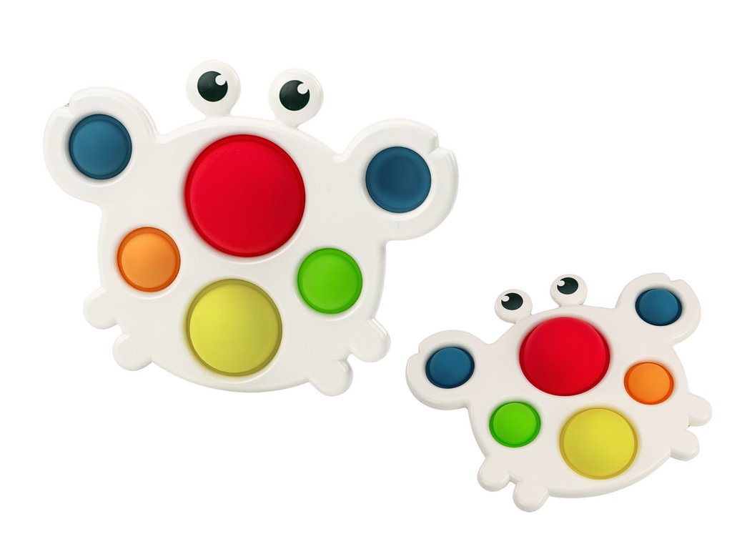 Plošča v obliki raka je igrača ustvarjena z mislijo na razvoj senzoričnih spretnosti pri najmlajših. Vsebuje barvne silikonske vdolbine v šestih različnih barvah, ki jih je mogoče potisniti na drugo stran.