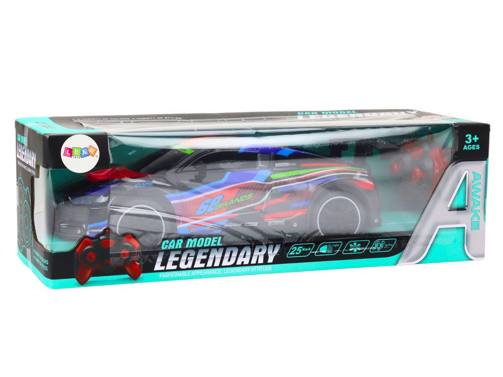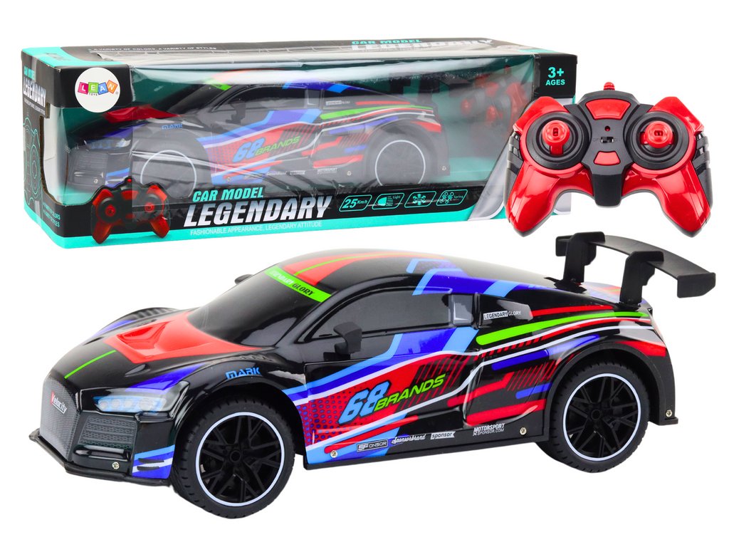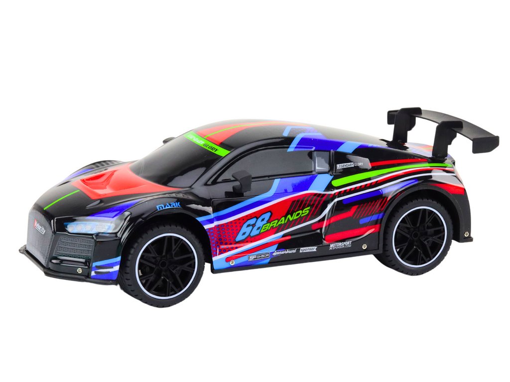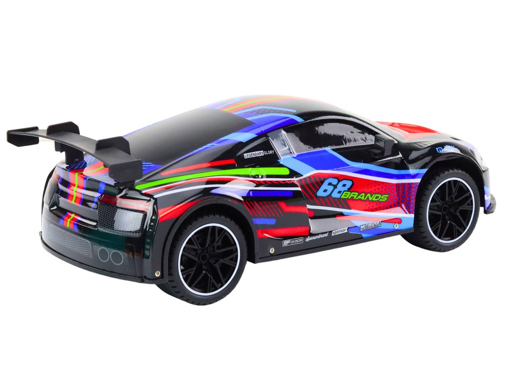 To impresivno športno vozilo na daljinsko upravljanje v merilu 1:10 bo zagotovo navdušilo ljubitelje hitrosti in modernega dizajna. Avto se ponaša z elegantno črno barvo s kontrastnimi modro-rdečimi elementi, ki mu dajejo dinamičen in športen videz. Vsaka podrobnost avtomobila je bila skrbno zasnovana, da odraža videz pravega športnega vozila. Športne linije, ki potekajo čez celotno karoserijo, in estetska dodelava, vključno s stilskim krilcem na zadnjem delu vozila, mu dajejo agresiven značaj in izboljšujejo aerodinamiko.