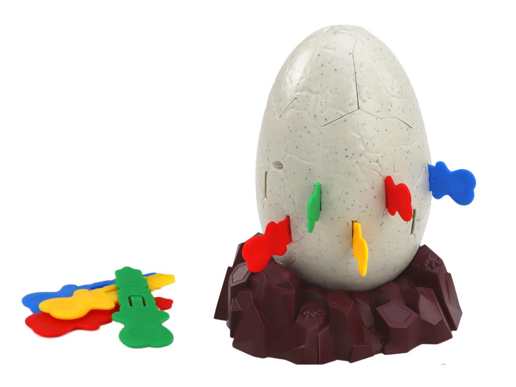 Položimo jajce na priloženo rjavo stojalo in nato vanj namestimo dinozavra. Zdaj se lahko začne zabava, ko nežno vstavljamo palčke okoli njega. Ta na videz enostaven postopek skriva najbolj zabaven trenutek - ko igralec vstavi palčko na pravo mesto, dinosaver nenadoma poskoči iz jajca! Ta trenutek bo spravil nasmeh na vsak obraz in povzročal valove smeha.