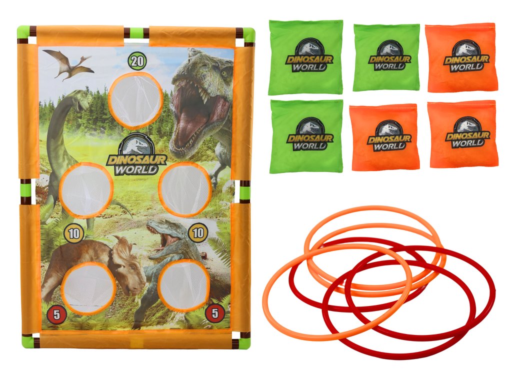 Igra vključuje trdno, barvito desko, okrašeno z upodobitvami različnih dinozavrov, kar ne le spodbuja zabavo, temveč tudi navdihuje otroško domišljijo. Deska je opremljena s točkovalnim sistemom, ki dodaja element tekmovalnosti in vznemirjenja med igro. V kompletu so tudi posebej oblikovane vrečke za metanje, ki zagotavljajo stabilnost letenja in natančnost zadetkov, prav tako tudi obroči.
