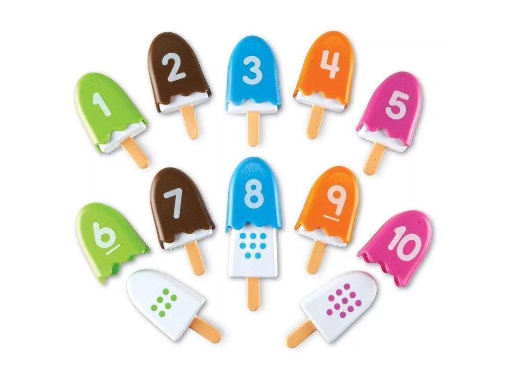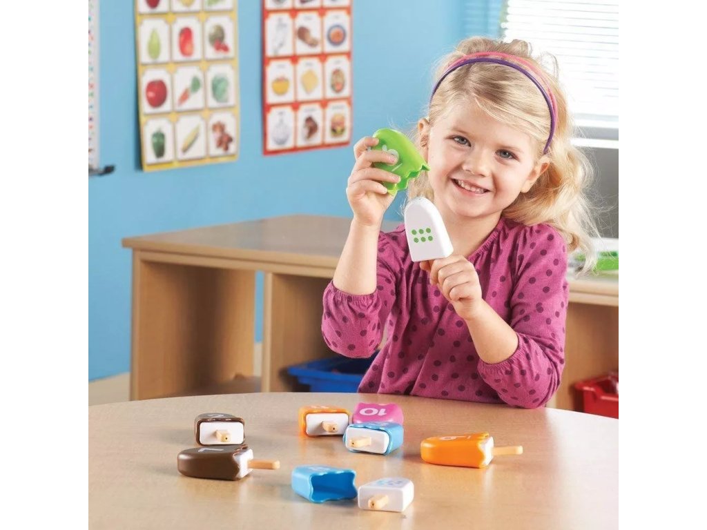 Posamezni deli sladoleda se potiskajo drug v drugega. Na notranjem delu so prikazane barvne pike, na zunanjem delu pa ustrezna številka z enako barvno kombinacijo. Zahvaljujoč temu otrok sam preveri, ali ima pravilno število.