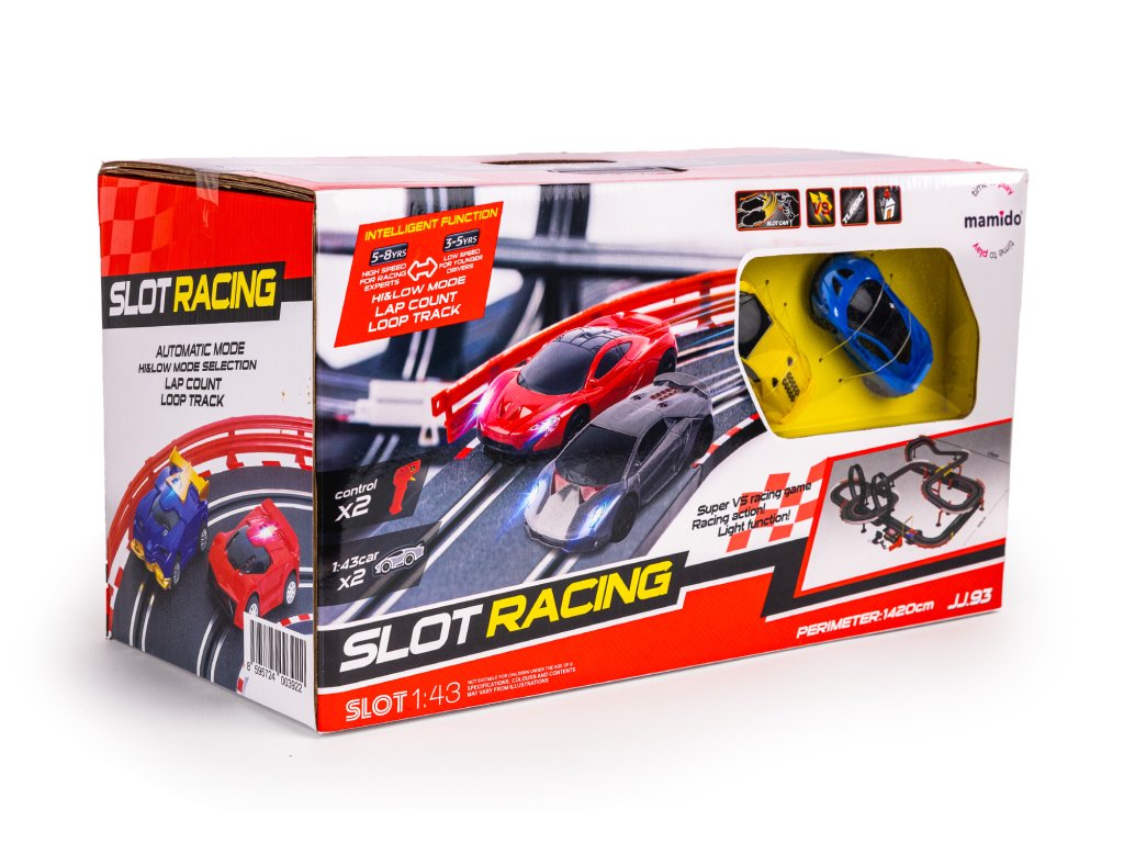 Velika steza za avtomobilčke z ostrimi zavoji in 360-stopinjskimi zankami. Set vključuje dva avtomobilčka, dva krmilnika in števec krogov. Steza ima dva režima hitrosti: počasnega in hitrega.
