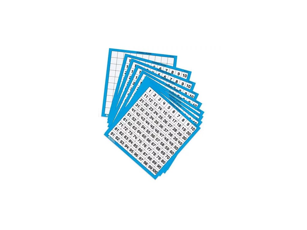 Praktičen komplet laminiranih stotičnih tabel, namenjen vadbi števil 1–100, ki se uporablja v pedagogiki Montessori.