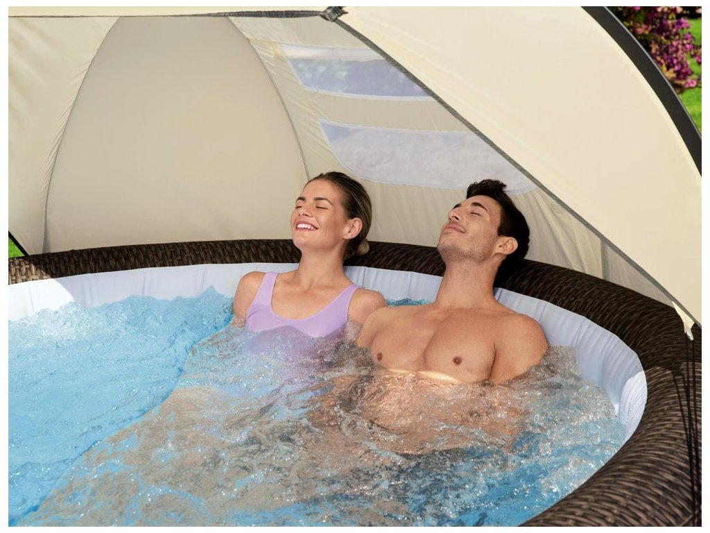 Če uživate v kopanju in cenite udobje, je ta streha za masažni bazen idealen izdelek za vas. Nudi zaščito pred soncem in vetrom ter tudi dežjem. Njena montaža je preprosta. Nameščeno prezračevalno okence iz mreže omogoča prost pretok zraka.