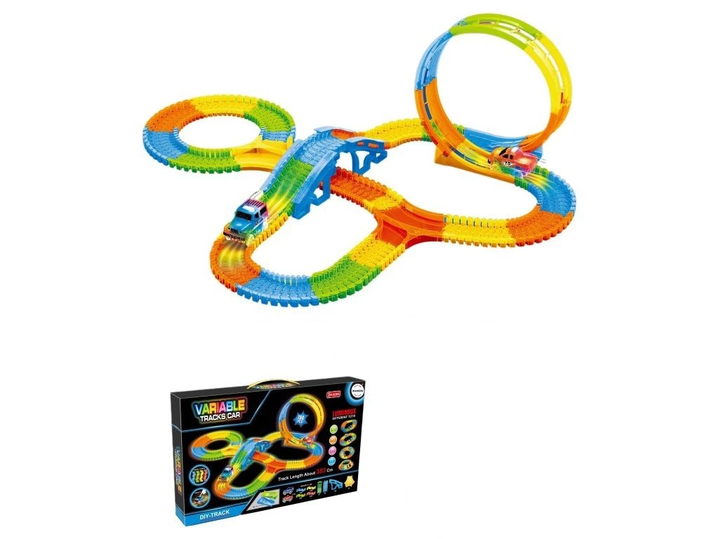 Pisana svetleča avtomobilska steza z skupno dolžino do 383 cm bo otrokom prinesla ure zabave. Steza je sestavljena iz 194 delov, ki jih je mogoče poljubno sestavljati, vključuje pa tudi mostove, zanke in ovinke. Priložen je LED avtomobilček, ki med vožnjo sveti in se pelje po celotni progi, vključno z zanko. Zahvaljujoč enostavnemu sistemu povezovanja si lahko otroci progo vsakič sestavijo drugače ter tako razvijajo svojo kreativnost in domišljijo.