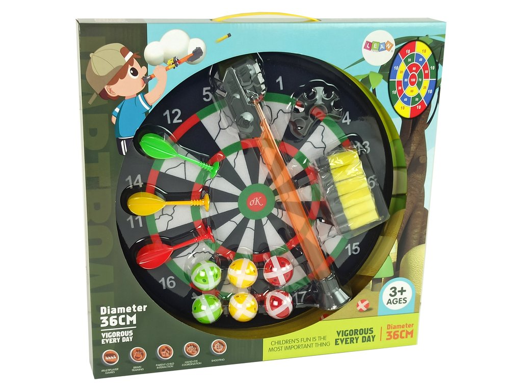 Ta črno-bela tarča za metanje je odlična zabava za vso družino in prijatelje. Tarča z mehko površino zagotavlja varno igro. V kompletu prejmete 6 plastičnih kroglic z ježkom, 3 puščice z ježkom in oranžno cevko za izstrelitev 6 nabojev z usti, kar igro naredi interaktivno in razburljivo.