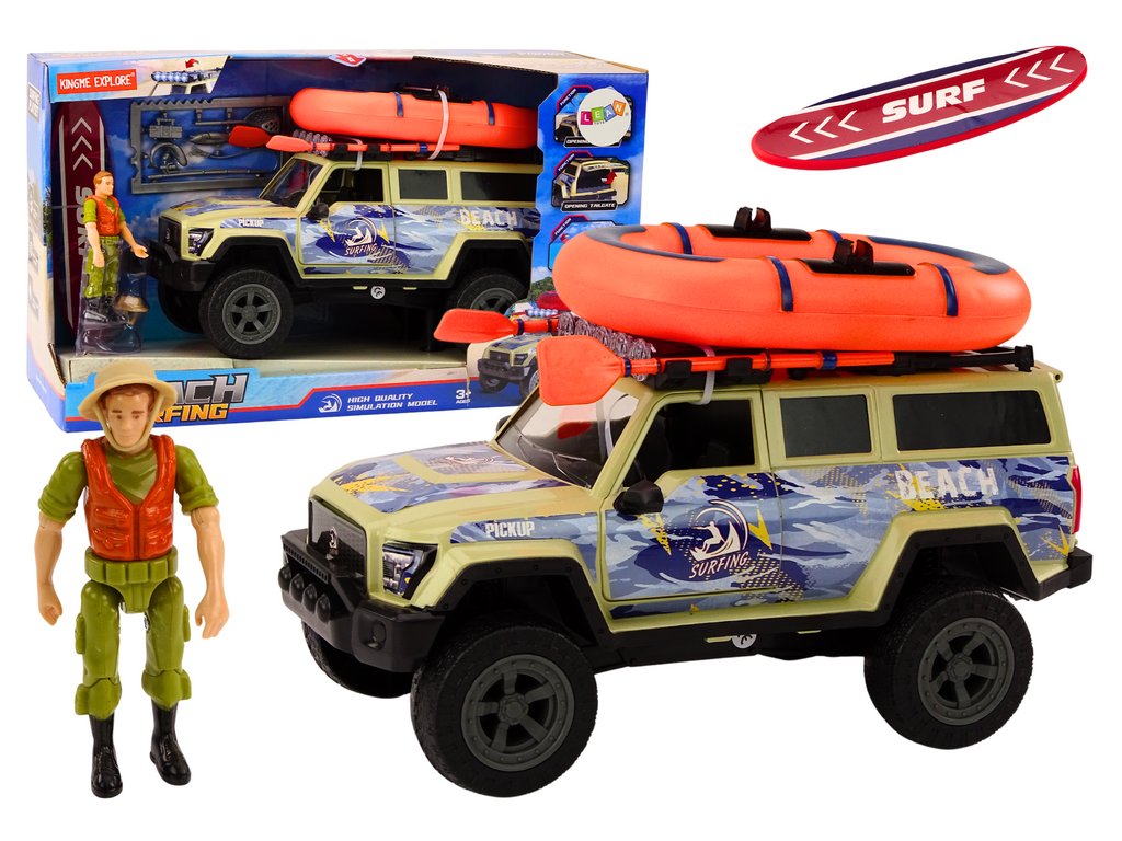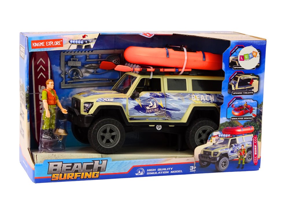 Terenski avto za ljubitelje vodnih športov je odlična igrača za mlade pustolovce. Vozilo v peščeni barvi z oznakami surfanja ima na strehi luči, ki svetijo ob pritisku na gumb, in oddajajo realistično zvok motorja. Na strehi je tudi ponton s vesli, kar igračo naredi še bolj realistično. Z odpiranjem vrat in prtljažnika je omogočen enostaven dostop za figure v notranjosti vozila.