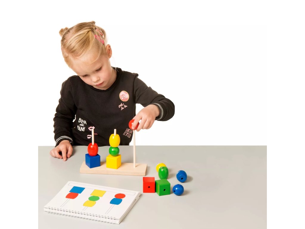 Kocke se navlečejo na igle v bloku po predlogi, ki je del paketa. Aktivnost spodbuja razvoj fine motorike, prostorskega zaznavanja, logičnega mišljenja, koncentracije in koordinacije.
