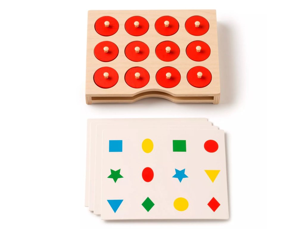 Vstavite eno igralno kartico v igralno škatlo in poskusite najti povezane pare z dvigovanjem rdečih lesenih diskov.