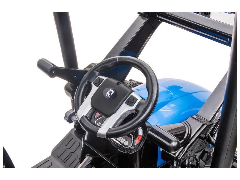 Traktor ima plastična kolesa in sedež. Traktor se samodejno zaustavi ob spustu stopalke za plin ter doseže hitrost do 6 km/h.