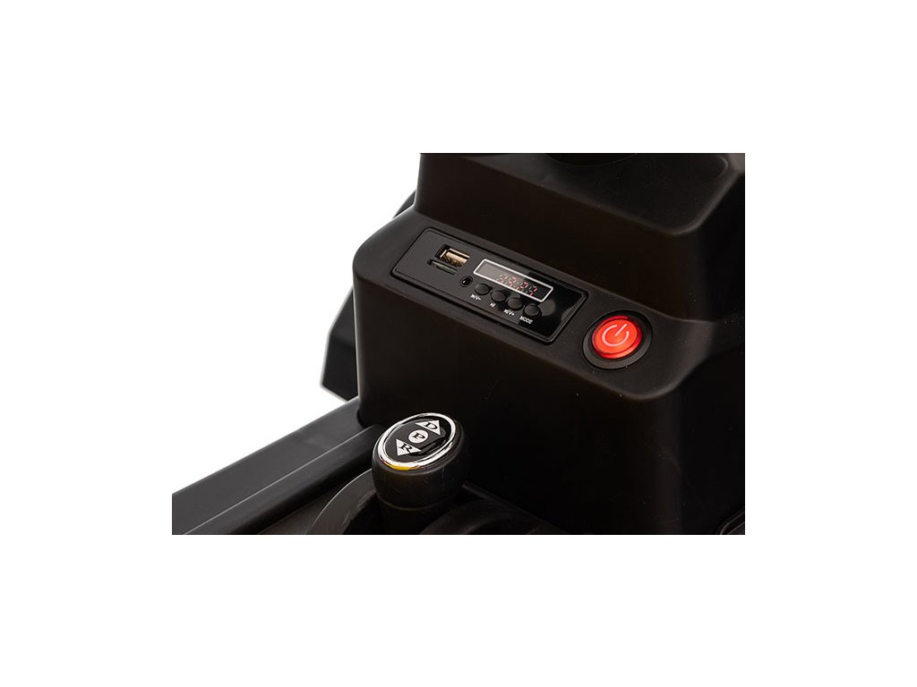 Udoben sedež z varnostnimi pasovi zagotavlja varnost otroka med vožnjo. Glasbeni panel z USB in AUX vhodom ter režo za pomnilniško kartico ponuja zabavo in interaktivnost. Sprednje luči prispevajo k bolj realističnemu videzu traktorja.