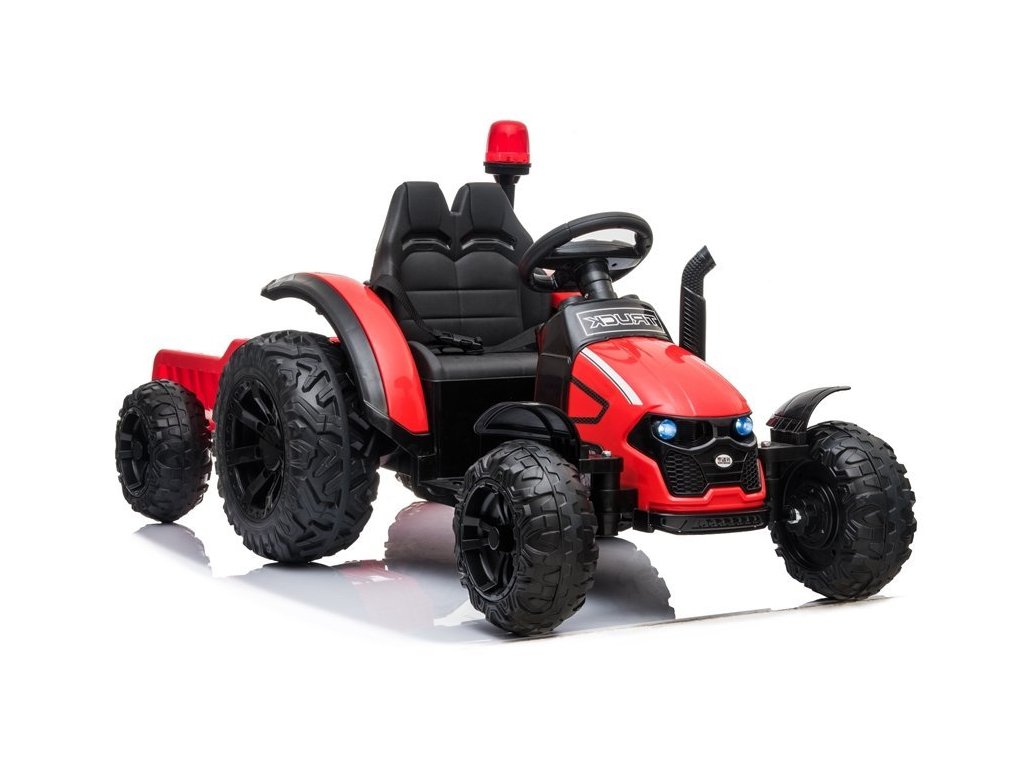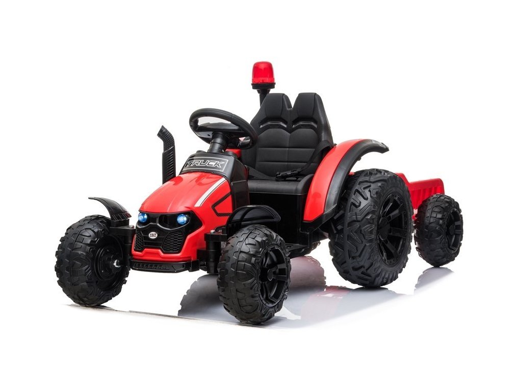 Otroški električni traktor s prikolico je primeren za vse otroke do 30 kg. Pene kolesa EVA so tiha in se prilagodijo različnim vrstam terena. Otrok se usede na udobno oblikovan sedež iz mehke ekološke kože. Vožnjo popestrijo zvočni in svetlobni efekti. Otroški traktor je velik, močan in izdelan iz najkvalitetnejših plastičnih materialov v sodobnem stilu ter zadovolji želje najmlajših ljubiteljev motornih vozil.